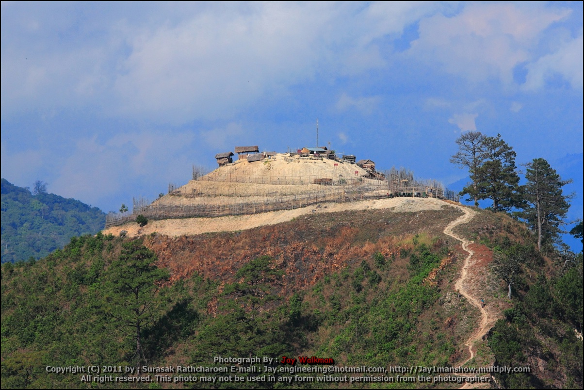 เนินสูงๆคือฐานทัพชายแดนของฝั่งพม่า ด้านขวาคือถนนที่เราแวะหยุดถ่ายรูปครับ พอเจอด่านตรวจของ เจ้าหน้าที่บอกกับเราจริงๆแล้วห้ามจอดถ่ายรูป เพราะมันอัตราย เพราะอาจจะโดนส่องเอาได้ เล่นเอาเสียวแว๊บเลย