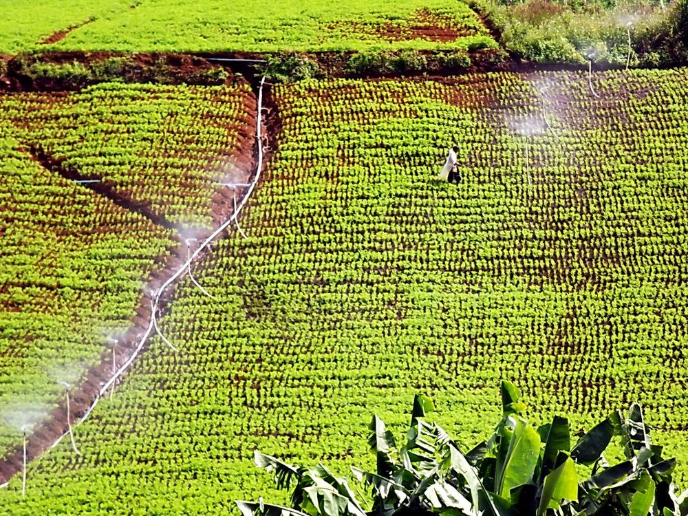 ส่องมาดูใกล้ ๆ จะเห็นชาวเขาใส่ผ้ายางกันฝน กำลังรดน้ำแครอทอยู่