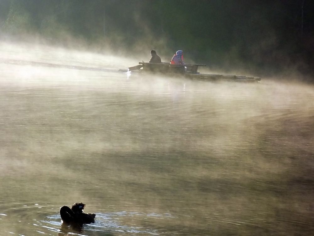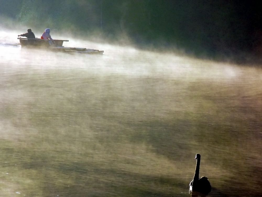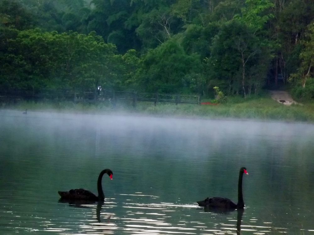 หงษ์ดำในน้ำ ท่ามกลางสายหมอก