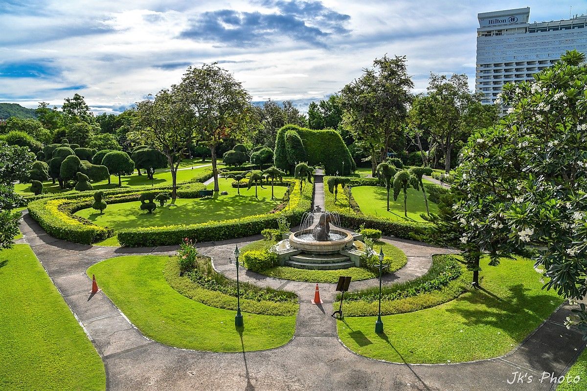 สวนของ รร ยามบ่ายแก่ๆ สวยงามมาก มีไม้พุ่มที่เขาดัด/ตัดตกแต่งเป็นรูปสัตว์ต่างๆ..ไกลๆเูเป็นพุ่มใหญ่ๆก็เป็นรูปช้าง...