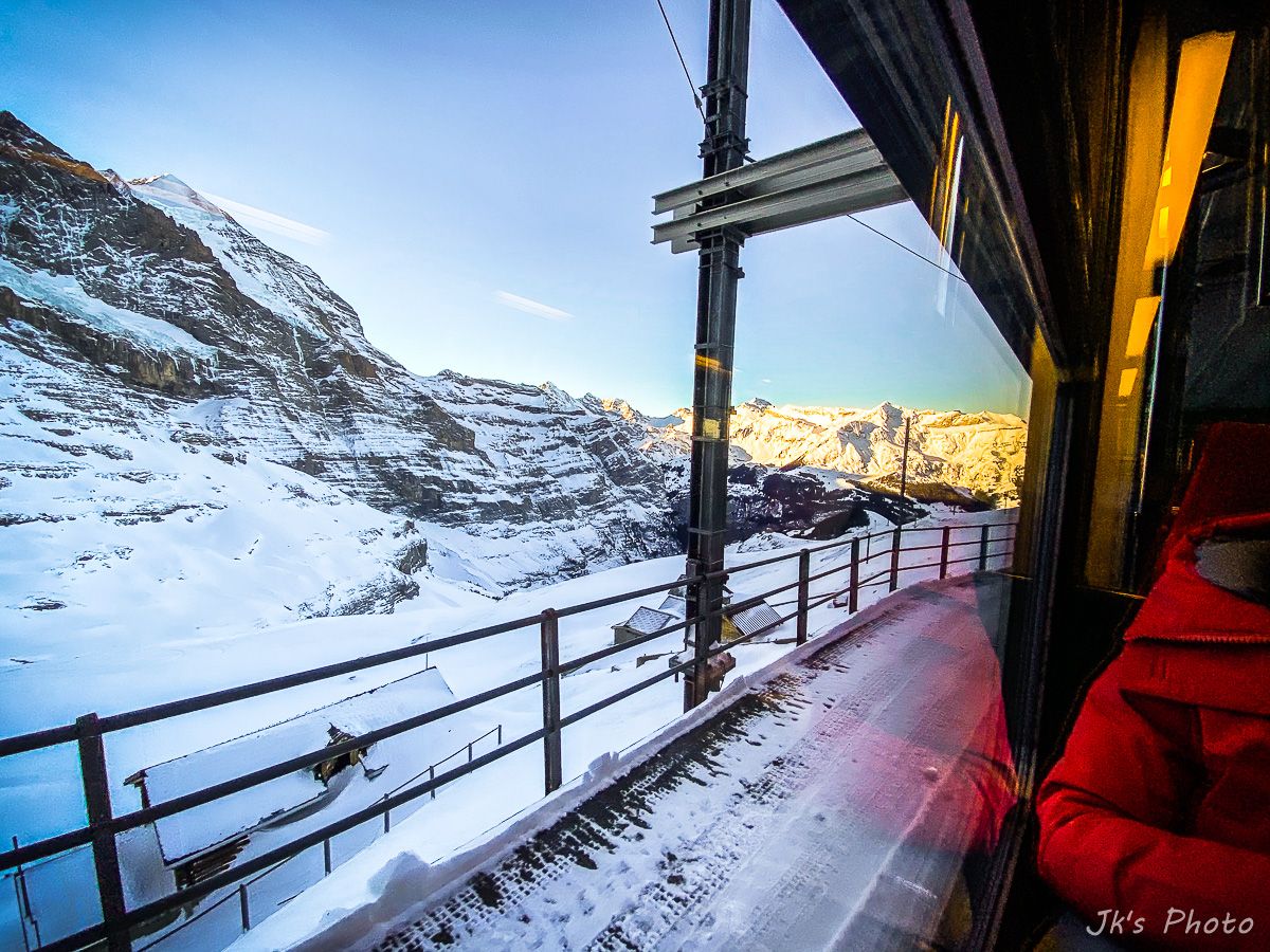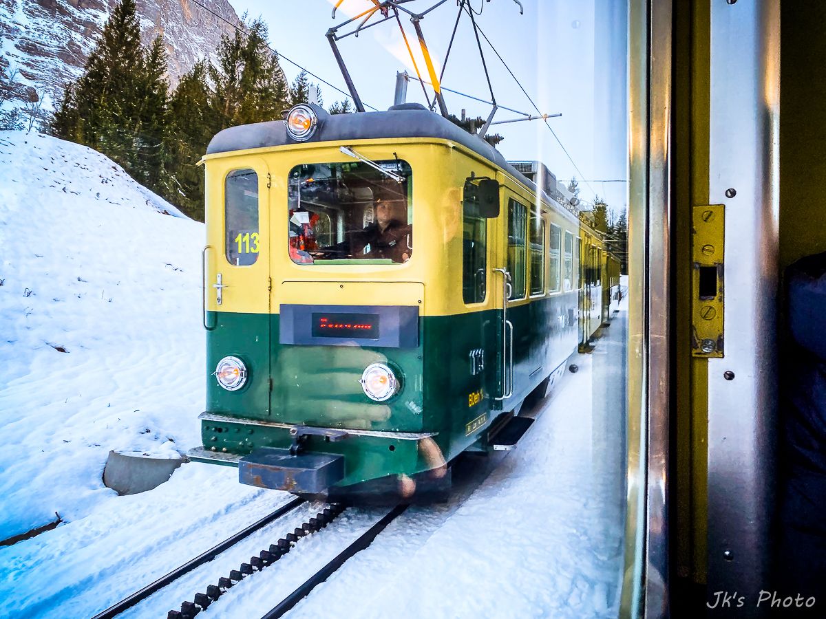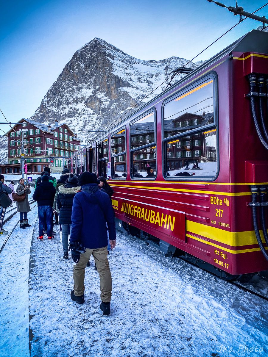 เปลี่ยนรถไฟ (สัเขียวเป็นสีแดง) ขึ้นเขา jungfrau