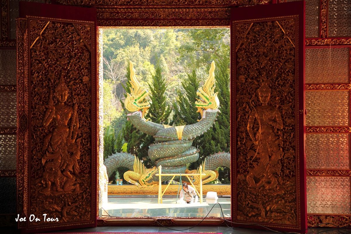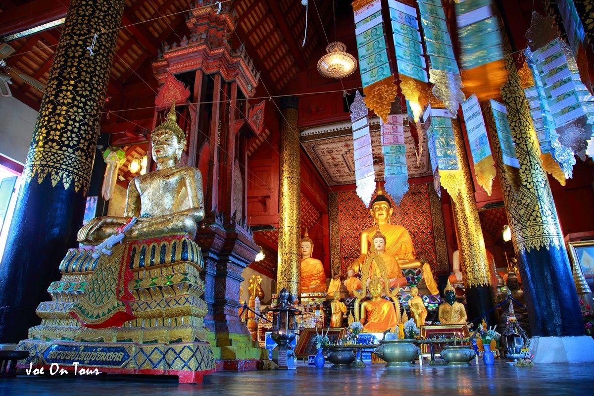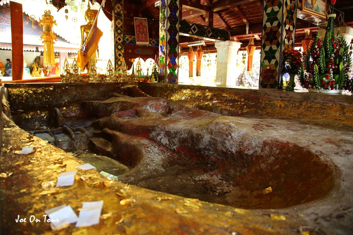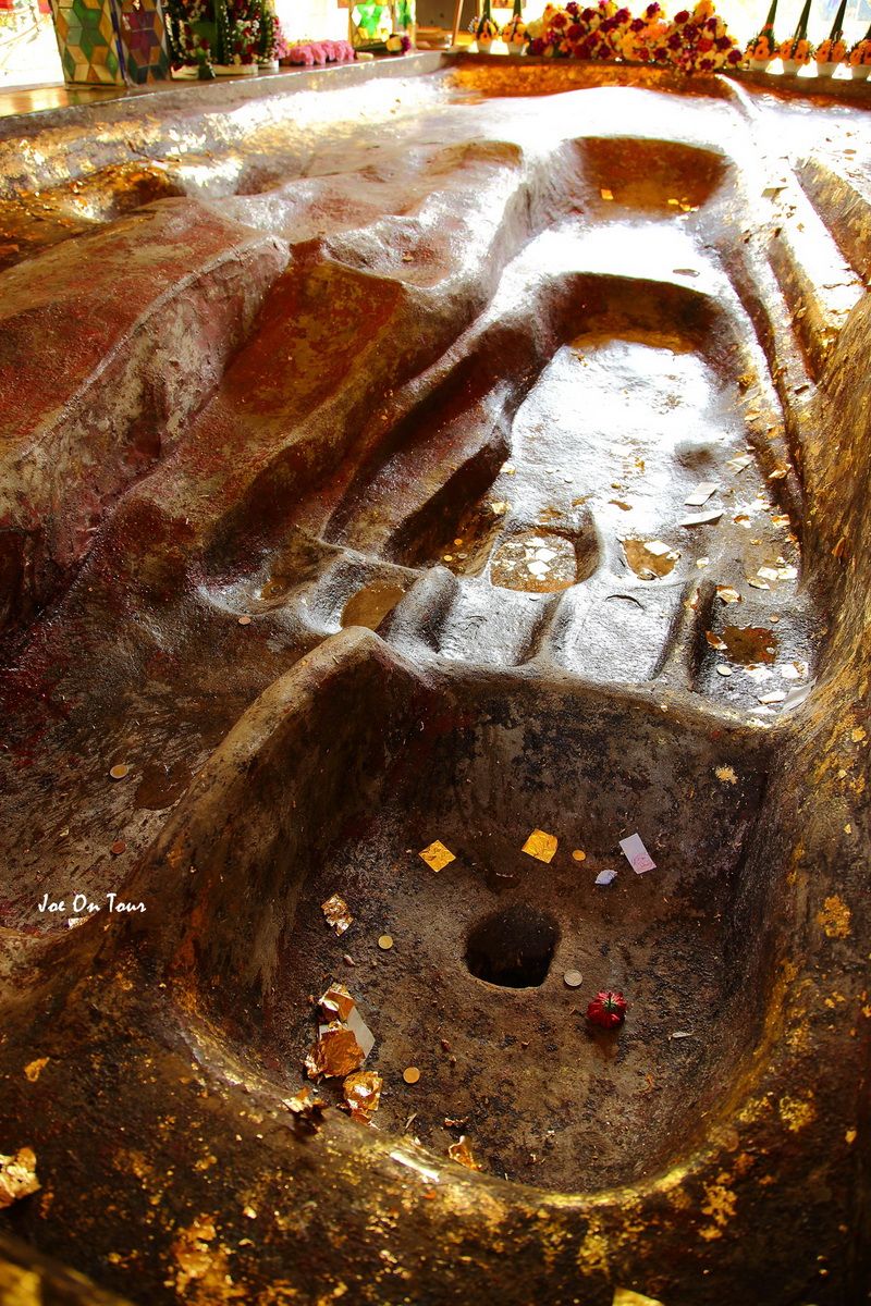 ในเมื่อกูตถาคตนิพพานไปแล้ว 2,000 ปี พระพุทธบาทสี่รอยนี้ก็จักปรากฏแก่ปวงคนและเทวดาทั้งหลาย ก็จักได้มาไหว้และบูชา เมื่อทรงอธิฐานและทํานายไว้ดังนี้แล้ว พระพุทธองค์ก็เสด็จไปเชตวันอารามอันมีในเมืองสาวัตถีวันนั้นแล เมื่อพระพุทธเจ้าทรงนิพพานไปแล้วเทวดาทั้งหลายก็นําเอาพระธาตุของพระ พุทธองค์มาบรรจุไว้ที่พระพุทธ บาทสี่รอยเมื่อพระพุทธองค์นิพพานล่วงแล้วประมาณ 2,000 วัสสา เทวดาทั้งหลายต้องการอยากให้พระพุทธบาทสี่รอยปรากฏแก่คนทั้งหลายตามที่พระพุทธองค์ทรงอธิฐานไว้ก็จึงเนรมิตเป็นรุ้งตัวใหญ่ ( เหยี่ยว ) ก็บินลงจากภูเขาเวภารบรรพตอันเป็นที่ตั้งแห่งพระพุทธบาทสี่รอยในปัจจุบันนี้ เพื่อบินลงไปเอาลูกไก่ชาวบ้าน ( คนป่า )ที่อยู่ตีนเขาเวภารบรรพตแล้วก็บินกลับขึ้นไปอยู่ยอดเขา มันก็โกรธมากจึงตามขึ้นไปคิดว่าจะยิงเสียให้ตาย มันก็ติดตามไป ค้นหาดูแต่ก็ไม่เห็นรุ้งตัวนั้นอีก แต่เห็นรอยพระพุทธบาทสี่รอยอันอยู่พื้นต้นไม้และเถาวัลย์ พรานป่าผู้นั้นก็ทําการสักการะบูชา เสร็จแล้วก็ลงจากภูเขา พอมาถึงหมู่บ้านก็เล่าบอกแก่ชาวบ้านทั้งหลายฟังความอันนั้นก็ปรากฏสืบๆกันไปแรกแต่นั้นไปคนทั้งหลายที่ทราบก็พากันไปสักการะบูชามาก แต่นั้นมาจึงได้ชื่อว่าพระบาทรังรุ้ง ( รังเหยี่ยว ) ในสมัยนั้นมีพระยาตนหนึ่งชื่อว่าพระยาเม็งราย เสวยราชสมบัติในเมืองเชียงใหม่ ได้ทราบข่าวจึงมีพระราชศรัทธาอยากเสด็จขึ้นไปกราบบูชาพระพุทธบาทสี่รอยก็นําเอาราชเทวีและเสนาพร้อมกับบริวารทั้งหลาย เมื่อพระยาเม็งรายกราบนมัสการเสร็จแล้ว ก็นําเอาบริวารของตนกลับมาสู่เมืองเชียงใหม่ ก็ตั้งอยู่เสวยราชมบัติตราบเมี้ยนอายุขัยแล้วก็เจริญตามรอยและได้ขึ้นมากราบพระพุทธบาท