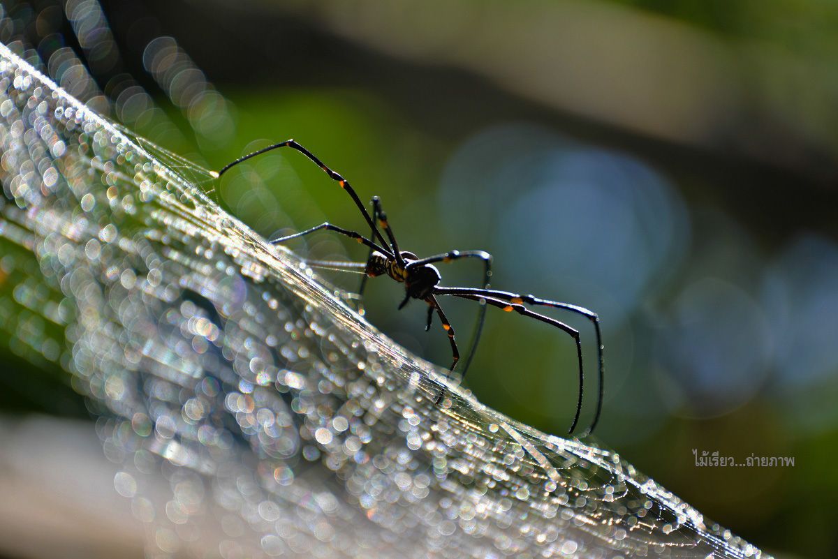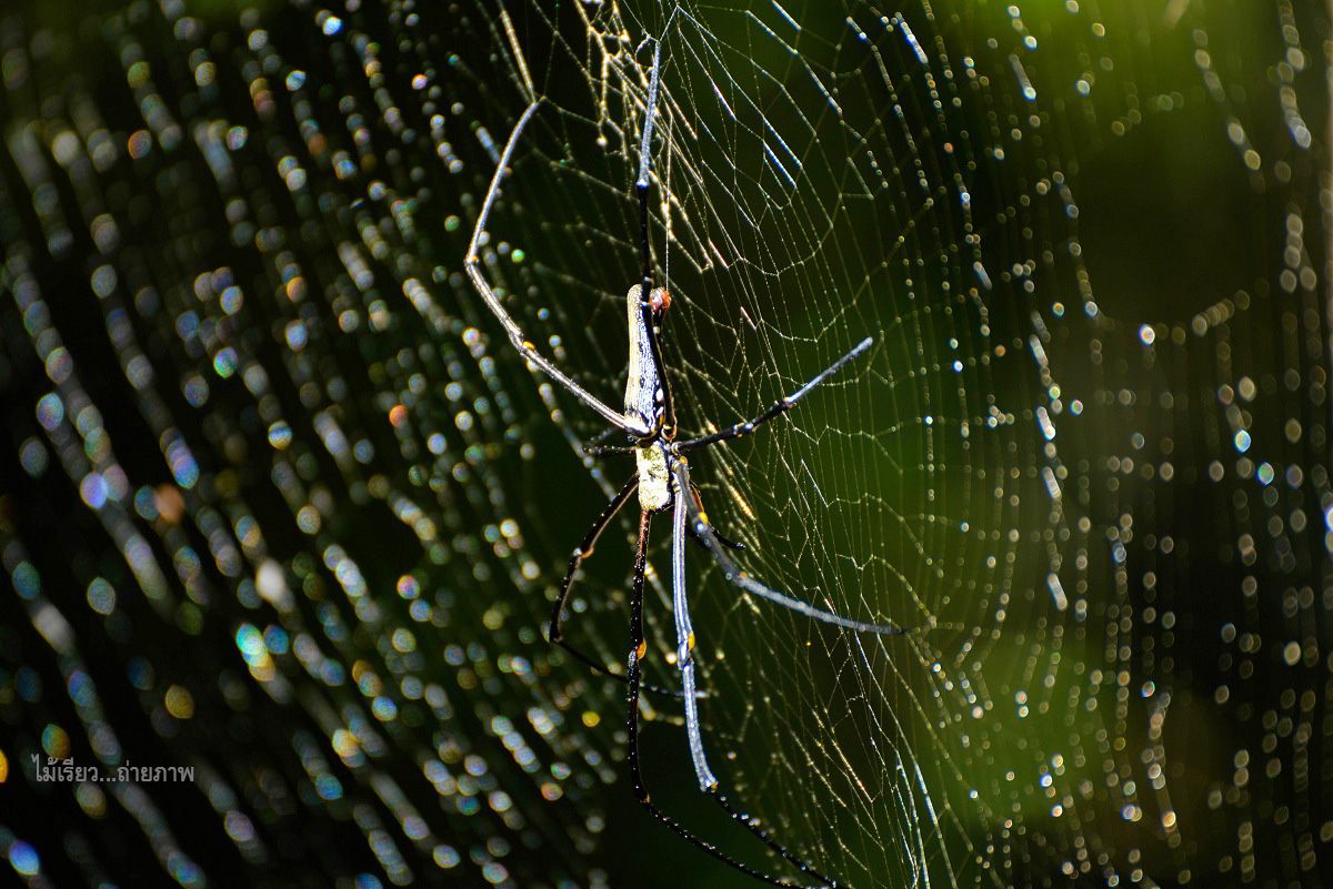 ใยแมงมุมที่จับน้ำไว้หลังฝนตกเมื่อต้องแสง..