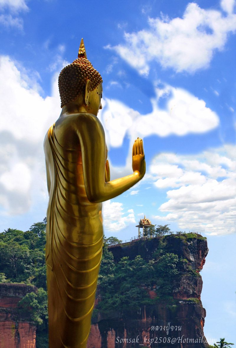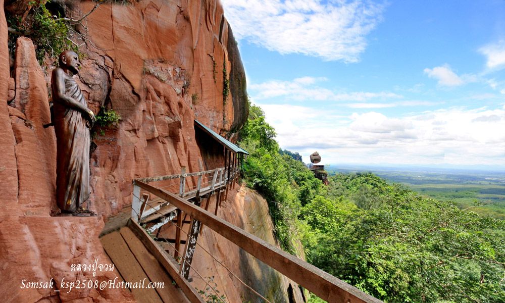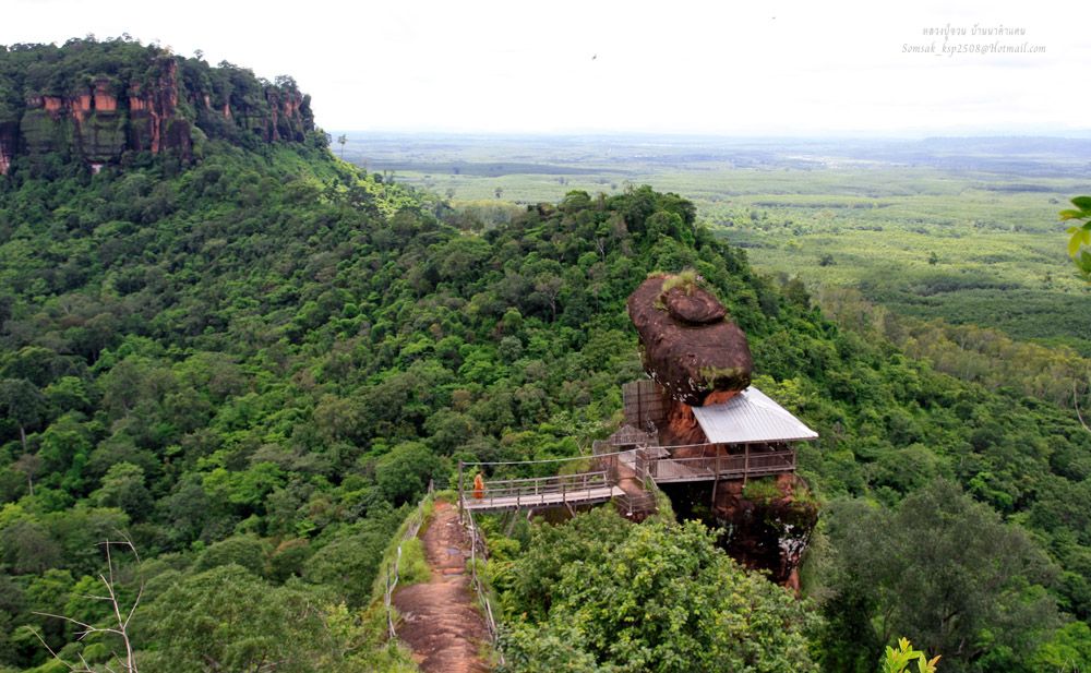 พี่เชิงดอยน้องชายพี่ม้าแกลบ กำลังมองหามุมสงบจากพุทวิหาร ด้านหน้าที่เห็นคือ เขตรักษาพันธุ์สัตว์ป่าภูวัว ที่ตั้งน้ำตกตาดชะแนน น้ำตกตาดนกเขียน น้ำตกเจ็ดสี น้ำตกภูถ้ำพระ น้ำตกถ้ำฝุ่น และ เขตรักษาพันธุ์สัตว์ป่าบึงโขงหลง