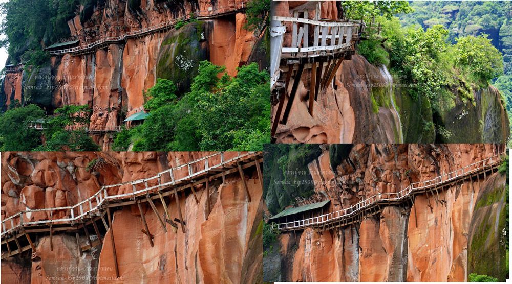 ค่อย ๆ ย่องที่ขั้นเจ็ด ฝนเริ่มปรอยเม็ดซะแล้ว มองลงข้างล่างไปเป็นเสียววูบตลอด ยิ่งจังหวะที่มีลมกระโชกตัดเข้ามาที่หน้าผา ไม้พื้นบางส่วนเริ่มเห็นร่องรอยการชำรุดตามสภาพ และ การซ่อมแซมเป็นช่วง ๆ
