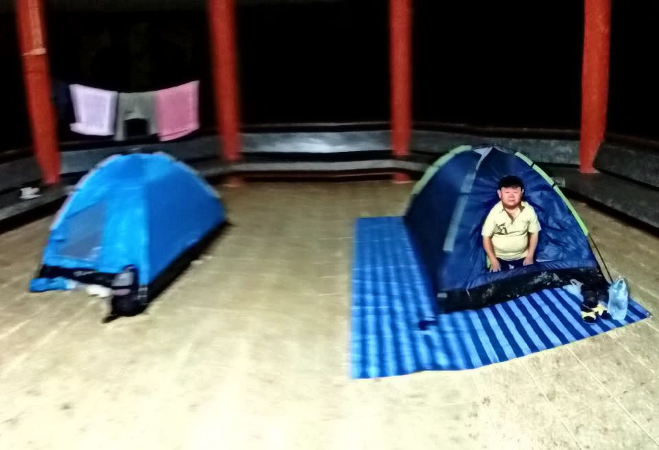 วันที่ผมไปถึง มีนักท่องเที่ยวกางเต้นท์อยู่แค่หลังเดียวเอง ที่นี่มียามเฝ้าตลอด 24 ชั่วโมง ยามบอกว่า กางเต้นท์ตรงไหนก็ได้ ไม่เสียค่าใช้จ่าย ผมเลือกกางเต้นท์ในศาลา เพราะมีปลั๊กไฟให้ชาร์จแบตฯด้วย เสร็จก็ประมาณ 2 ทุ่ม เขาก็ยังอนุญาตให้อาบน้ำได้ คนละ 30 บาท