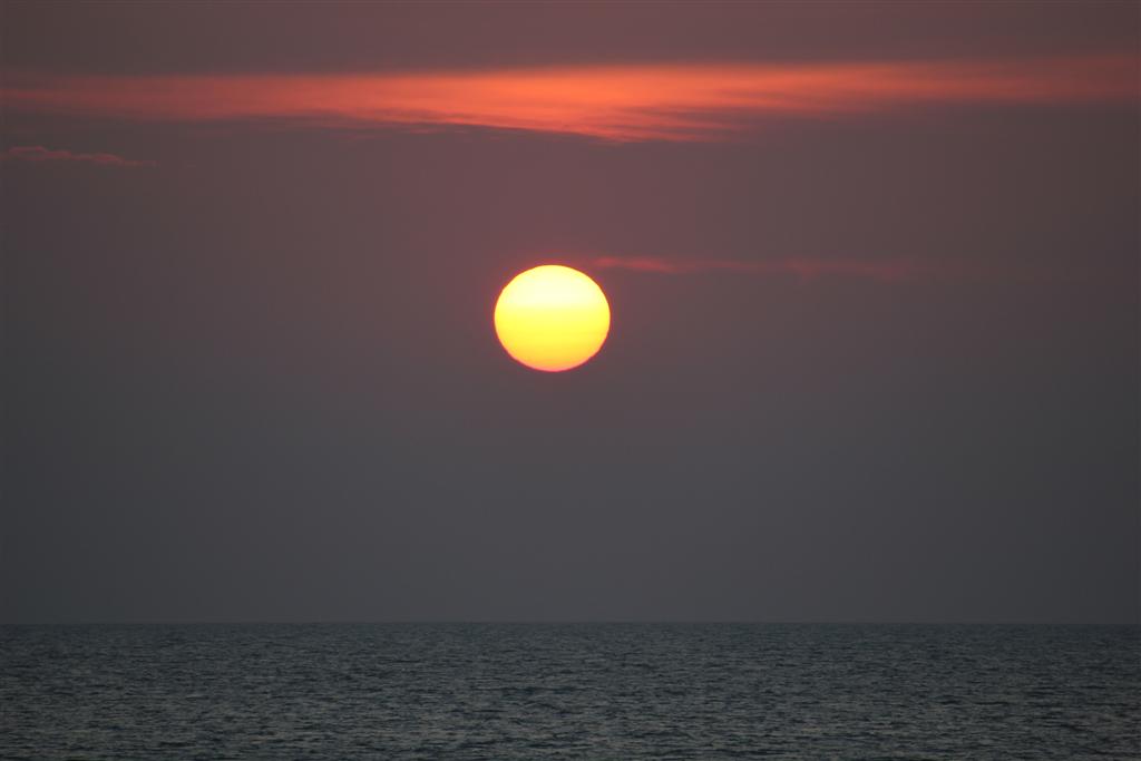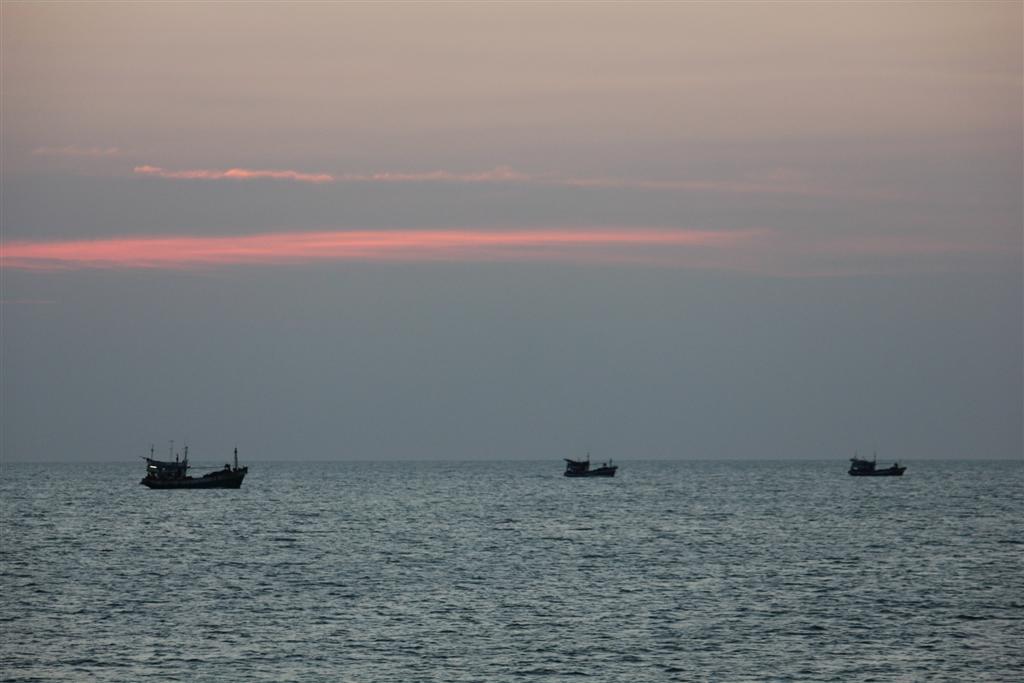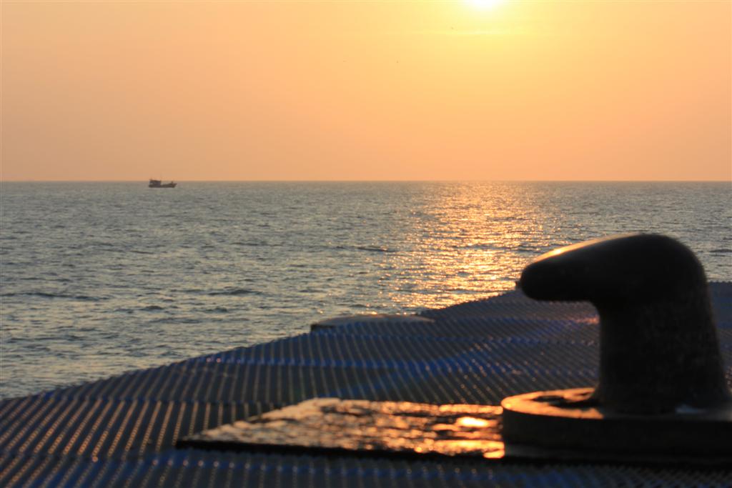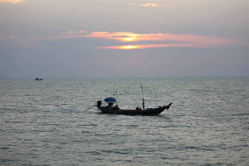 พระอาทิตย์เริ่มลับขอบฟ้า มองไปทางทิศตะวันตก ผ่านช่องปากน้ำดอนสัก ซึ้งจะมีเรือชาวประมงเข้าออกมิขาดสาย