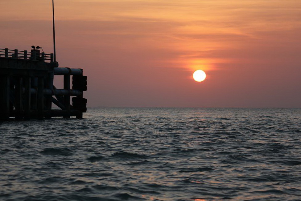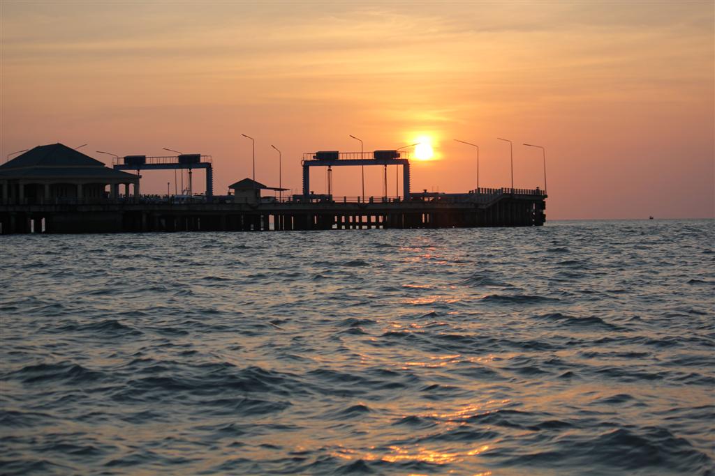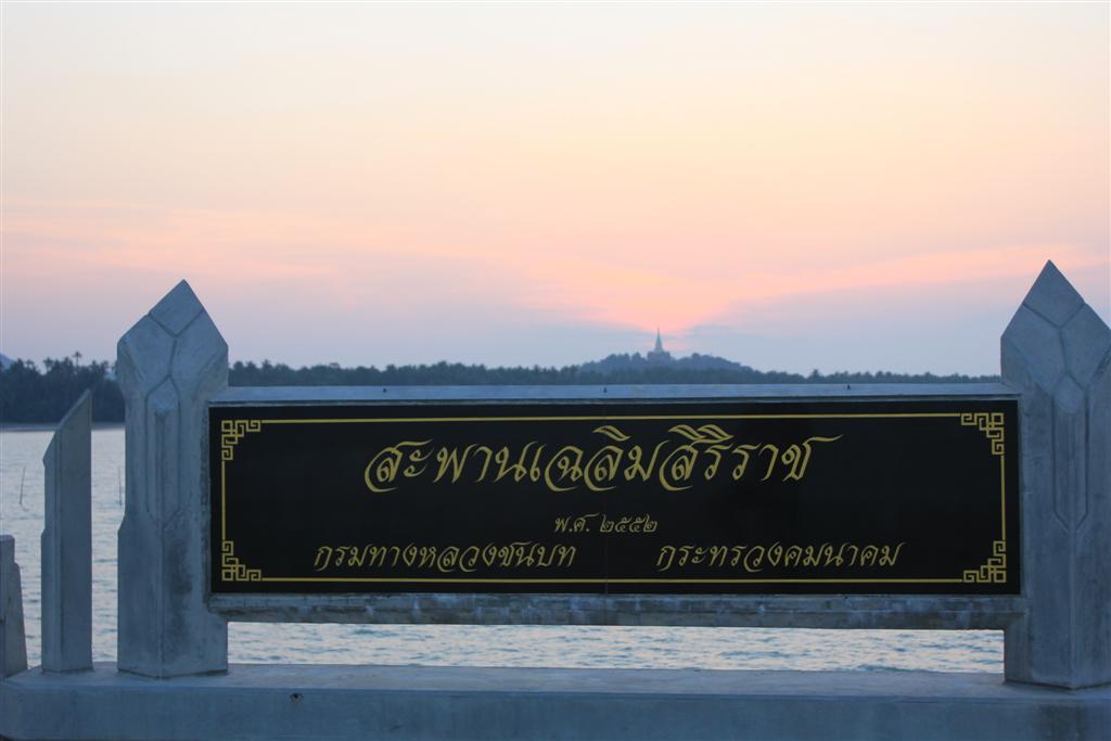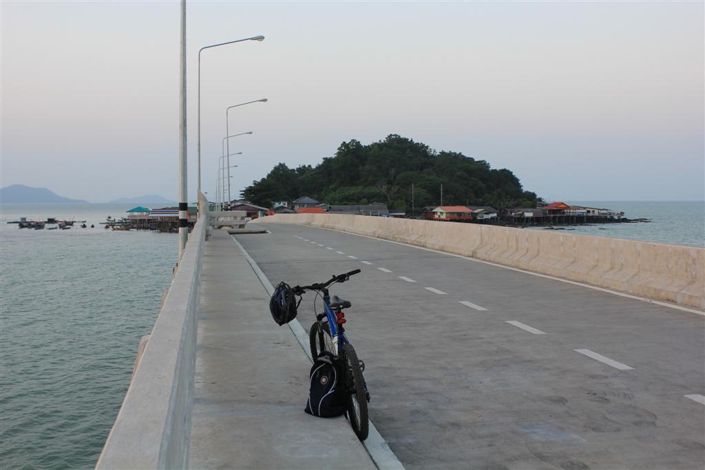 สพานข้ามไปหาเกาะ ซึ่ง นักปั่นจักรยานใช้เป็นจุดพักระหว่างทาง นักท่องเที่ยวมายืนชมพระอาทิตย์ตกดิน เด็ก ๆมาวิ่งเล่น ตกปลา