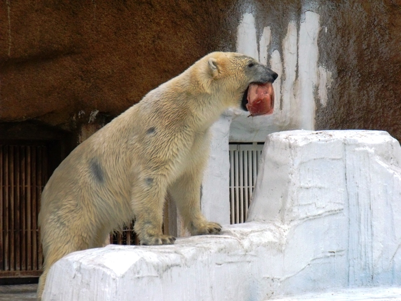 เจ้าหน้าที่โยนเนื้อแช่แข็งลงไปในน้ำ พี่หมีรีบกระโดดไปคว้ามาทันที