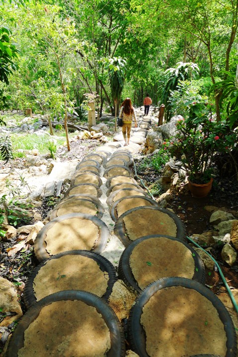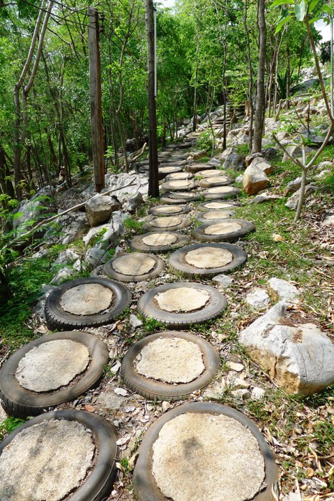ที่วัดไอเดียแจ่ม ใช้ยางรถยนต์เททับด้วยปูนซีเมนต์ทำเป็นขั้นบันได