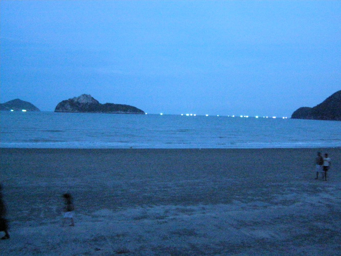 บรรยากาศตอนกลางคืนหัวค่ำ จะเห็นเรือประมงเปิดไฟส่องปลาหมึก