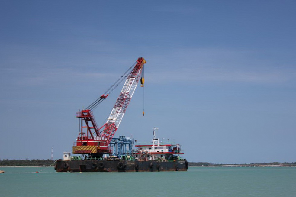 เรือแพขนาดใหญ่ติด เครน พยายามจะกู้เรือจม ช่วงมรสุมที่ผ่านมาหลายวันแล้วยังใม่สำเร็จ
