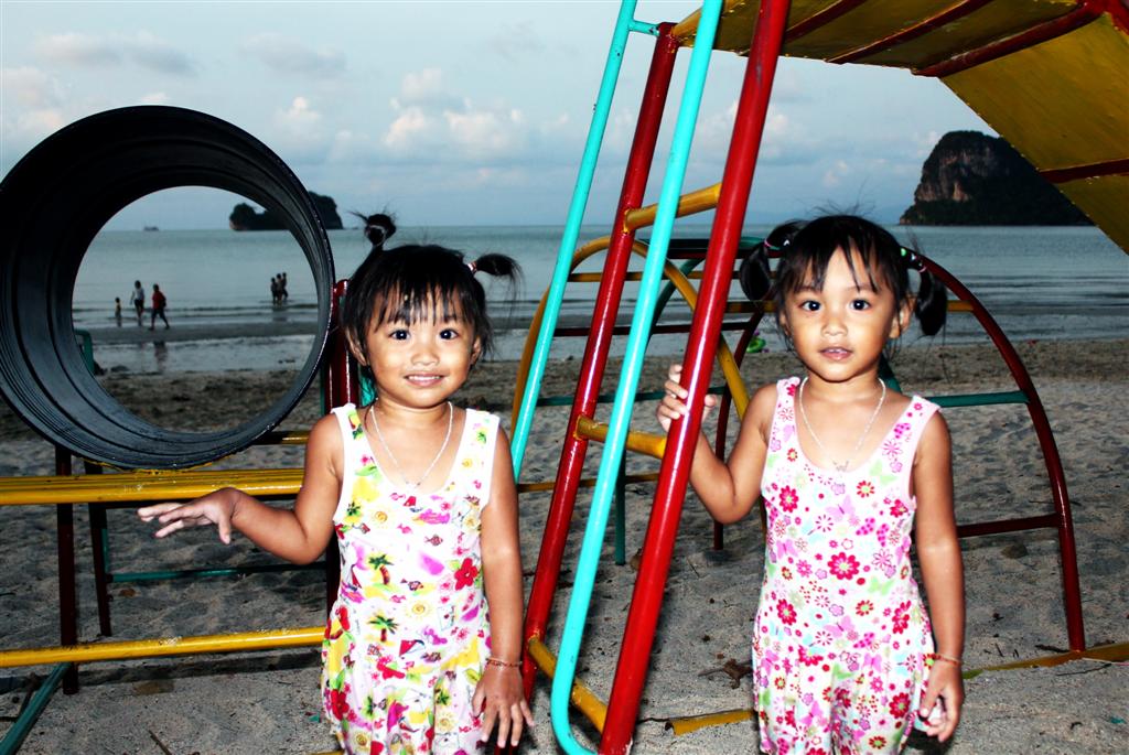 หลานสาวฝาแฝดจากเมืองสุราษฎร์ก็มาเล่นน้ำบ่อย ที่นี่ เนื่องจากลานกว้างหลังน้ำลด และน้ำตื้น