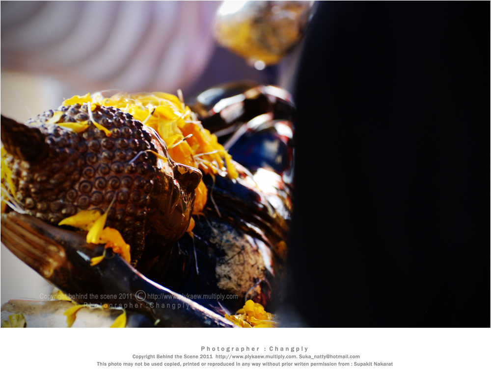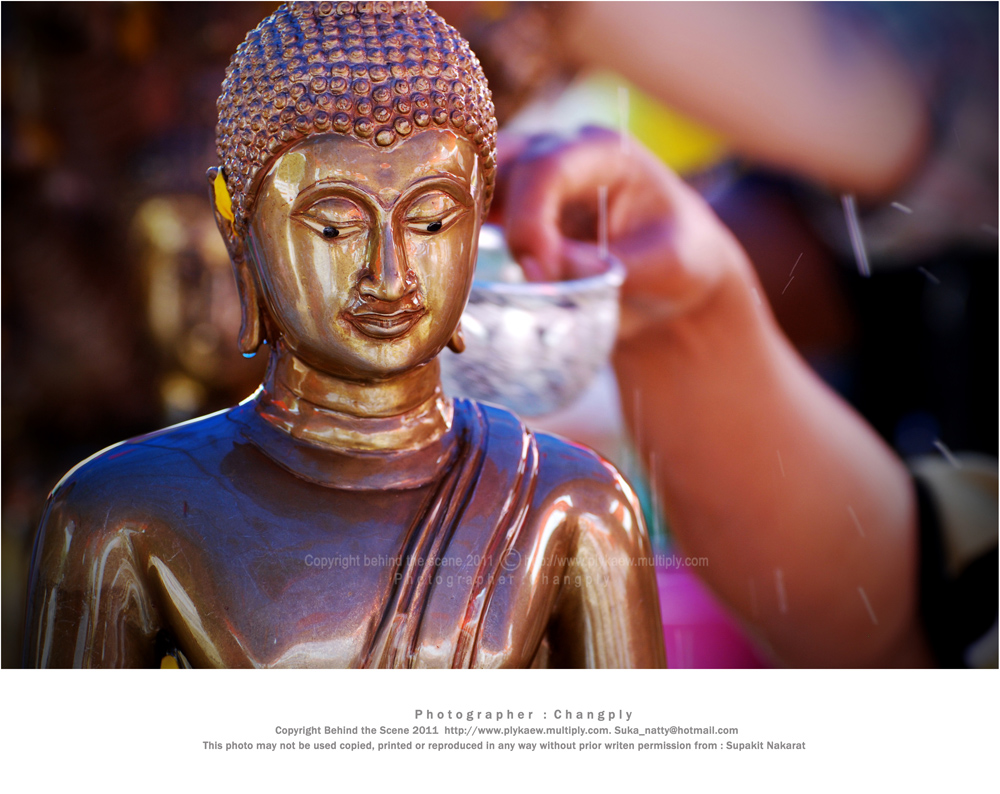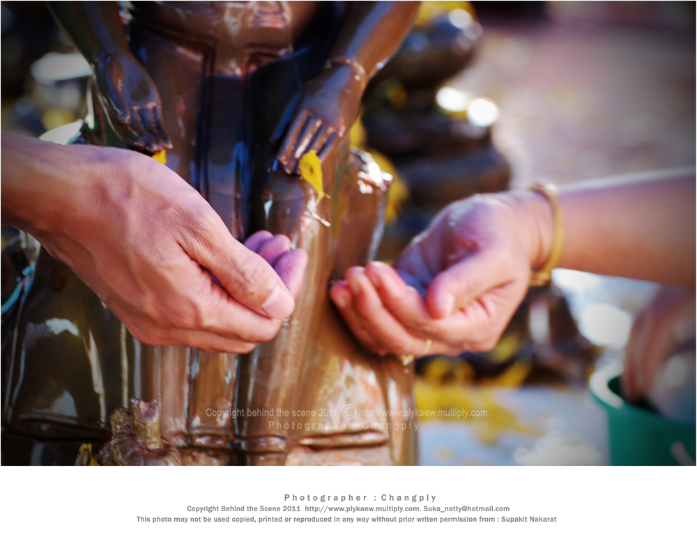 ได้ยินเสียงเค้าประกาศว่า สรงน้ำพระแล้ว ให้เอามือรองน้ำที่ไหลลงมาจากพระพุทธรูป แล้วเอามาลูบศรีษะ