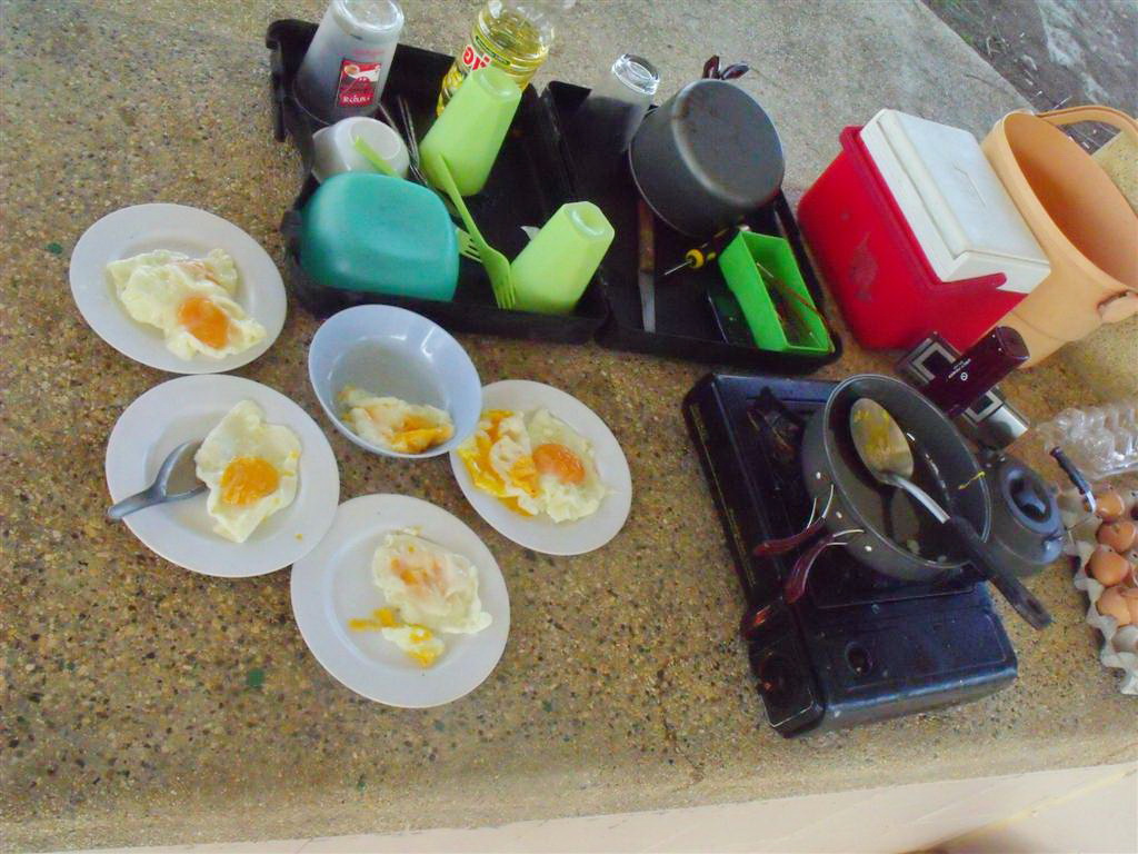 ป้าปุ๋มทำอาหารเสร็จ เรียกให้ไปกินอาหารเช้าแล้ว....แบบง่ายๆ ไส้กรอก บีลักกี้ หนมปัง ไข่ดาว โอวัลติน กาแฟ