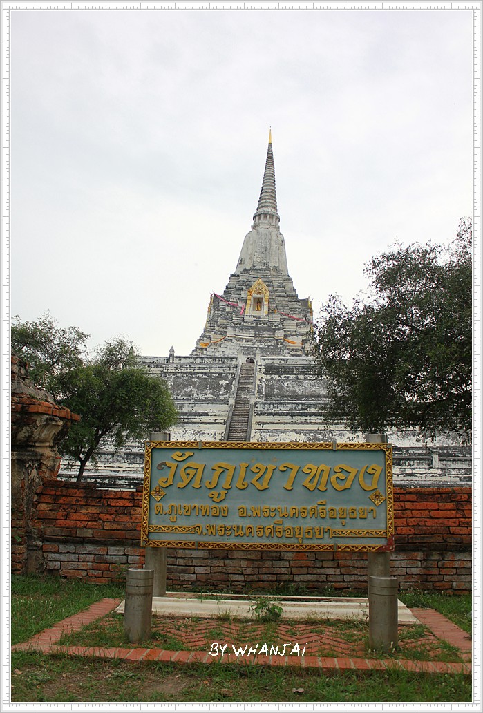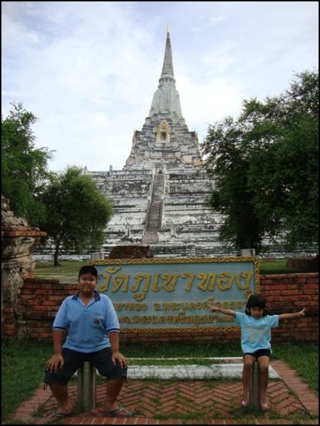 มาขอพรต่อวัดภูเขาทอง ...เจดีย์ภูเขาทอง เป็นมหาเจดีย์สำคัญตั้งอยู่นอกเกาะกรุงศรีอยุธยา ด้านตะวันตกเฉียงเหนือไปประมาณ 2 กิโลเมตร พงศาวดารอยุธยากล่าวว่า วัดภูเขาทอง นั้น สถาปนาในรัชสมัยพระราเมศวร หรือสมัยต้นอยุธยา เจดีย์ภูเขาทอง ที่ปรากฎอยู่ในปัจจุบันนี้น่าจะได้รับการบูรณปฏิสังขรณ์ให้เป็นมหาเจดีย์สูงเด่นในระหว่างรัชสมัยพระมหาธรรมราชาถึงสมัยพระเพทราชา (ระหว่าง พ.ศ. 2112-2246) และมีการบูรณปฏิสังขรณ์ใหญ่อีกครั้งในสมัยพระเจ้าบรมโกศ หรืออยุธยาตอนปลาย นั่นคือ มีฐานทักษิณ 4 ชั้นเป็นรูปสี่เหลี่ยมจัตุรัส ทั้ง 4 ด้านมีบันไดขึ้นไปจนถึง,านทักษิณชั้นบนสุด บนชั้นนี้มีฐานสี่เหลี่ยมขององค์เจดีย์ที่มีอุโมงค์รูปโค้งเข้าไปข้างใน ซึ่งมีพระพุทธรูปประดิษฐานอยู่ 1 องค์ สูงขึ้นไปเป็นฐาน 8 เหลี่ยม