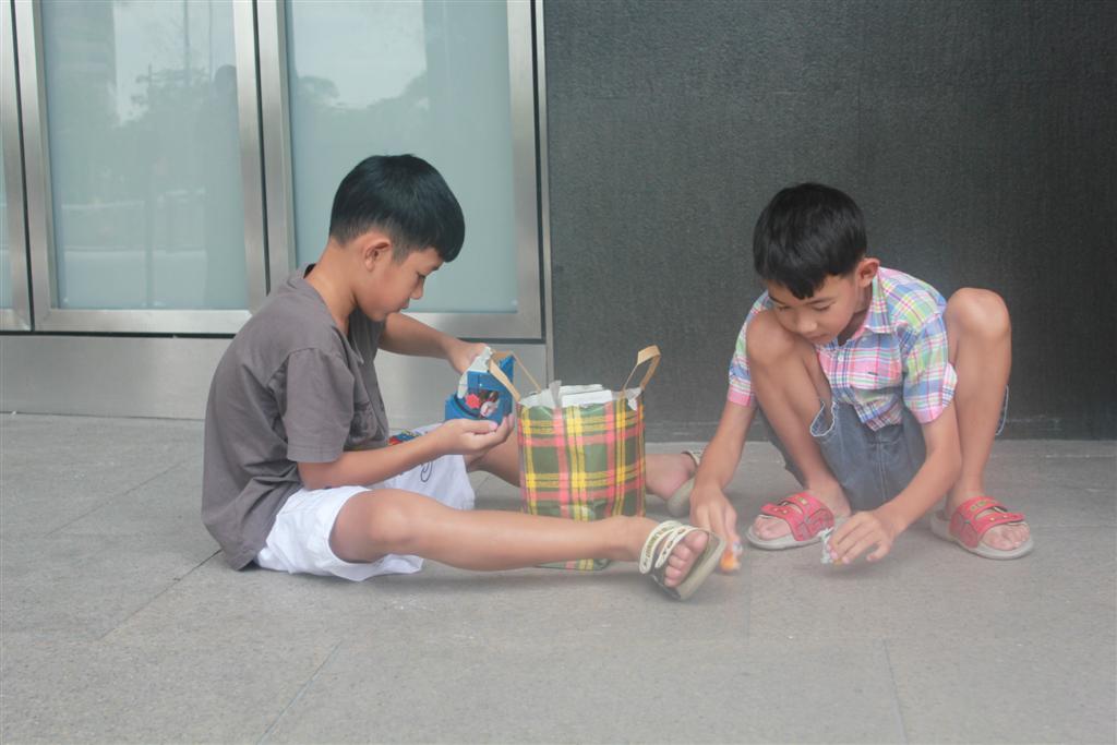 และระหว่างคอยคนอื่น ๆ และรอรถอยู่ หน้าตึกแฝด สองพี่น้อง เมษ และพฤษกก็เก็บอาการใม่อยู่ ฉีกห่อของเล่น ๆ กันตรงนั้นเลยครับ