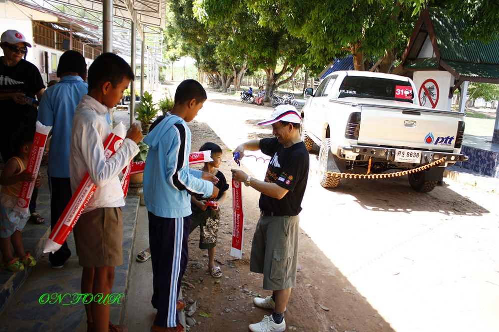 มารอเพื่อนสมาชิกที่จะเอาของเข้าไปแจกนักเรียนที่ไทรโยก