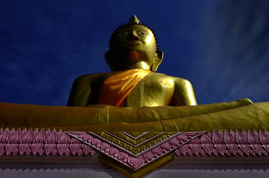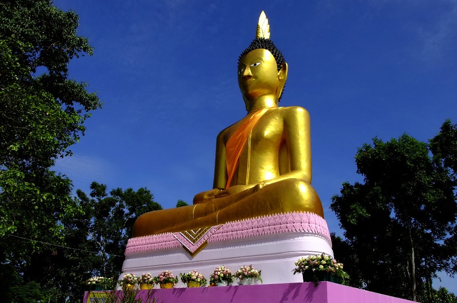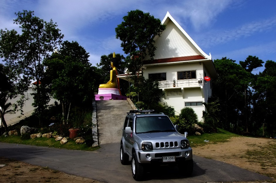 มองผ่านแมกไม้ไปเห็นวัดมีพระประธานตั้งโดดเด่นอยู่..เดียวเราไปไหว้พระก่อนไปทะเลกัน