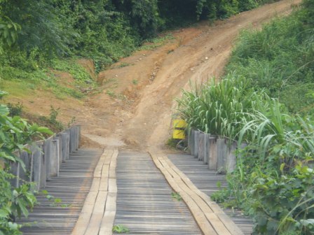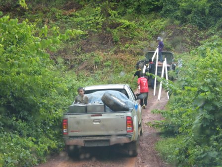 รถที่ขนเหล็กไปทำสะพานแขวนที่ข้ามจากฝั่ง บ้าน โปร่งลึก ไปบ้าน บางกลอย ทำเหล็กล่น ครูจากที่โรงเรียนไปช่วยกันขน กับขึ้นไปบนรถ
