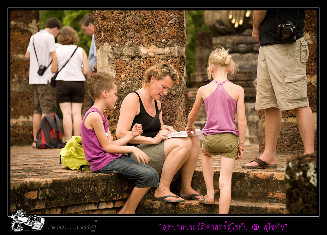 ภาพนี้ดูแล้วก็เป็นภาพนักท่องเที่ยวชาวต่างชาติทั่วๆไปครับ แต่ที่ผมเห็น และได้ยินมา แม่กำลังนั่งอ่านประวัติศาสตร์สุโขทัยให้กับลูกๆทั้ง 2 คนฟังจากหนังสือที่เค้าหาซื้อมาเป็นข้อมูล เห็นแล้วก็รู้สึกดีๆครับ