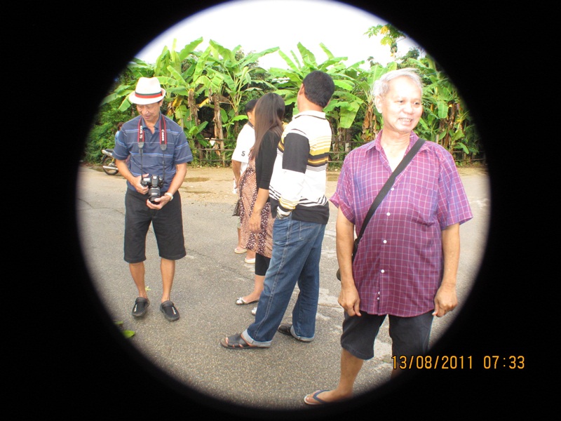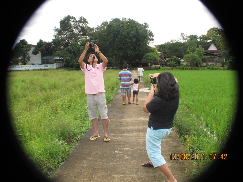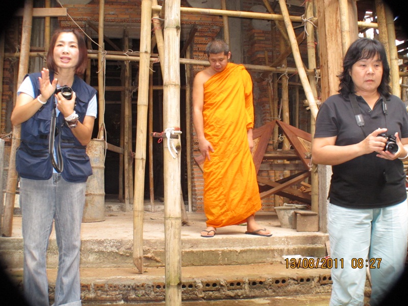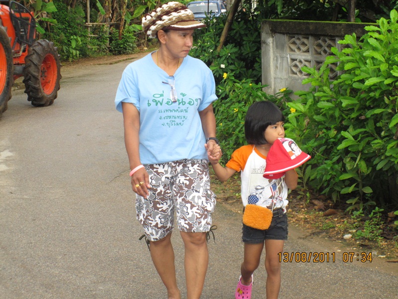 ยืนรอขบวนจะไปทำบุญที่วัดค่ะ