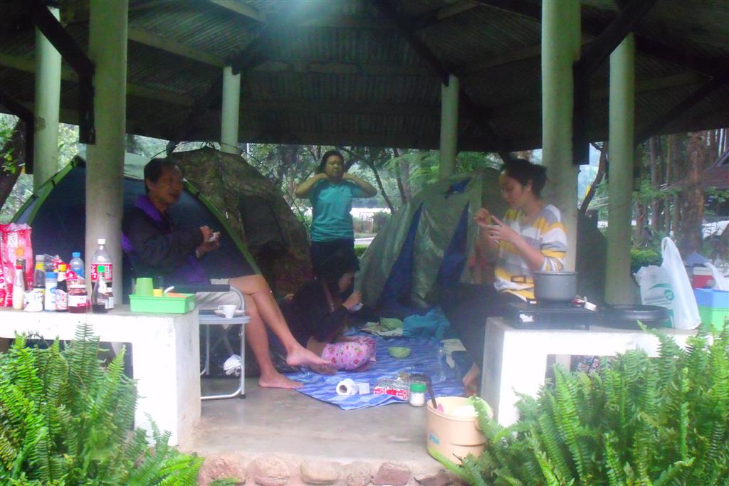 ฝนตก เลยกางเต้นท์ อัดแน่น 3 เต้นนท์ เป็นปลากระป๋อง อยู่ในศาลาเดียวกัน