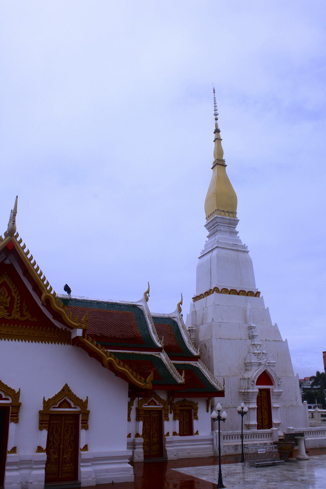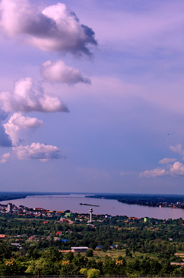 เราย้อนกลับ เข้ามาที่ตัวเมือง แล้วก็ขึ้นไปดูเมืองมุกดาหารที่ ภูมโนรมณ์ ซึ่งอยู่ห่างจากตัวเมือง 5 กม. (ภูผาเทิบห่างตัวเมือง 15 กม.) ในภาพจะเห็นหอแก้ว(โดมกลม ๆ) ด้านขวาเป็นเมืองลาว ไกลออกไปเป็นสะพายข้ามน้ำโขง