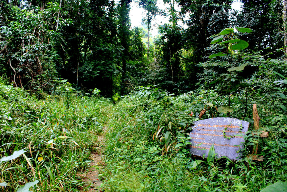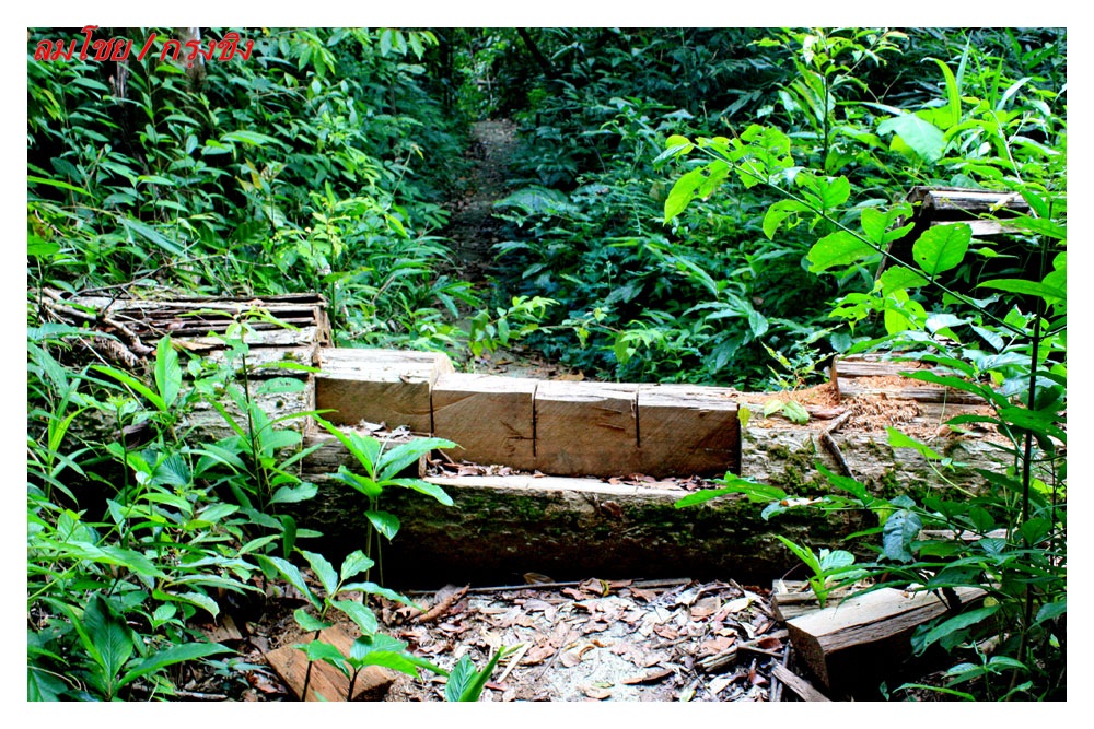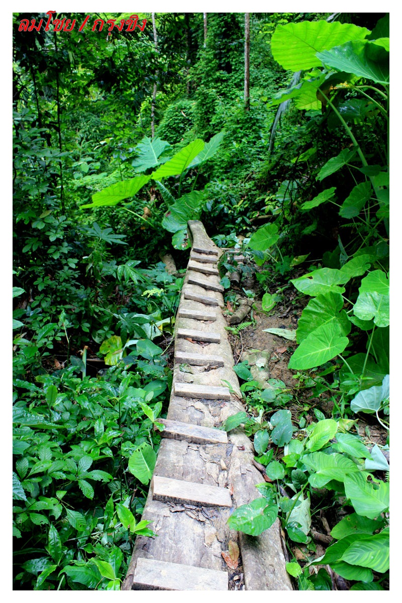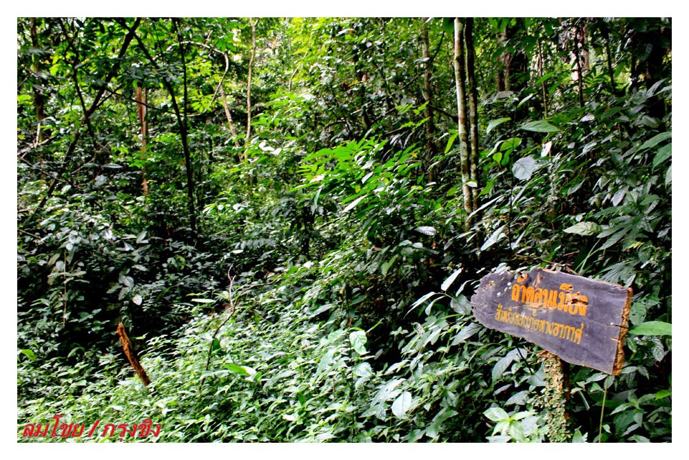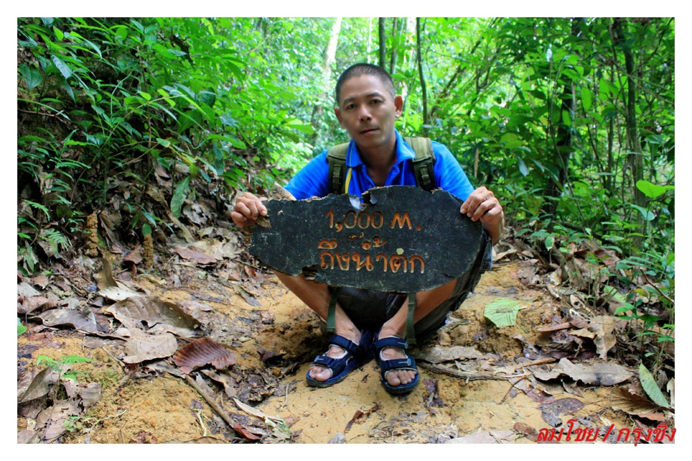 เดินมาได้สักพัก ก็สุดทางเดินปูน เข้าสู่ทางเดินแบบธรรมชาติ ก็ลั้นล๊าไปเรื่อย จนเจอป้ายวางที่พื้นริมทางเดิน หยิบขึ้นมาตั้งท่าหลายท่า จะเอาแบบ อ.จิ้นก็ดูซ้ำ ๆ จะเอาแบบพังพลายก็ดูเชย ๆ งั้นเอาท่าใหม่ "ท่ากระปุกออมสินหยอดเหรียญรูปลิงเหนื่อย" ล่ะกัน แอ็คนี้จึงได้ภาพดังนี้