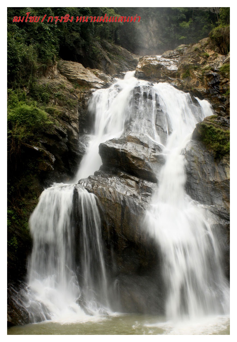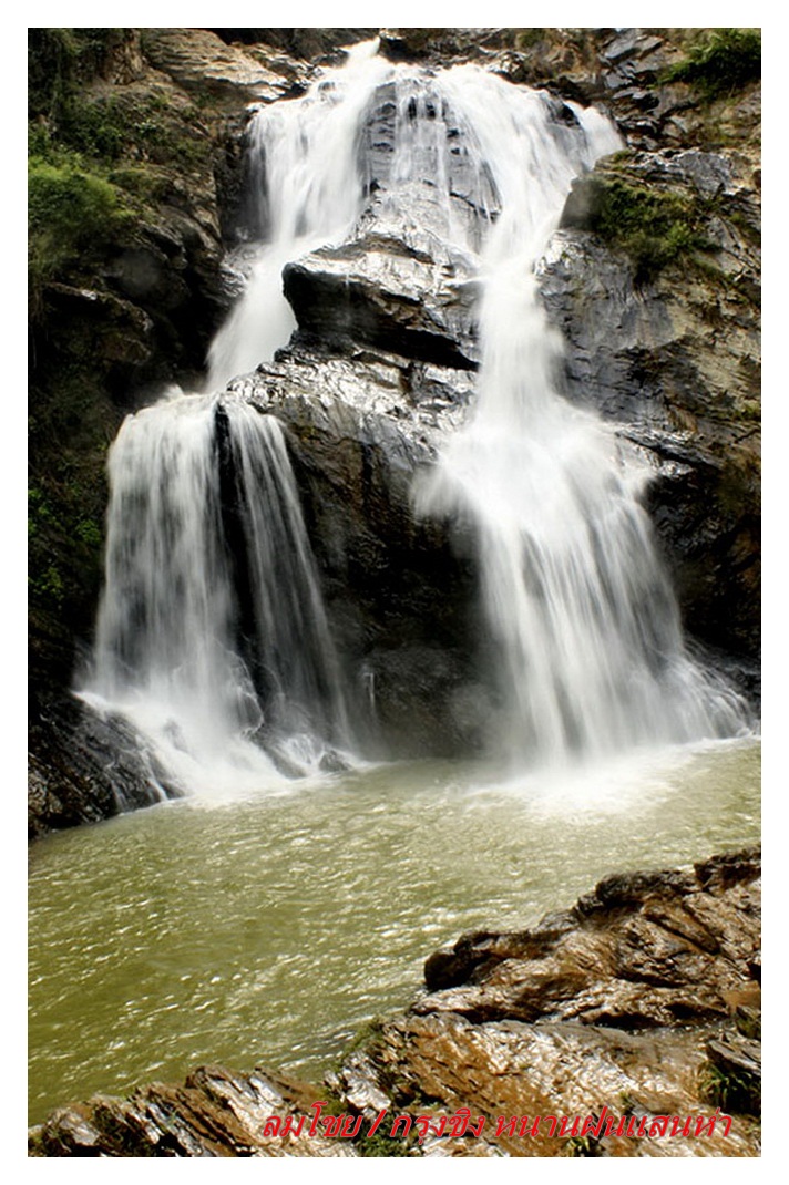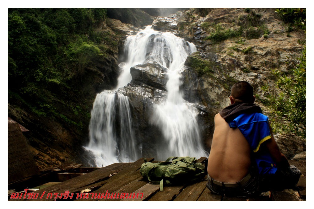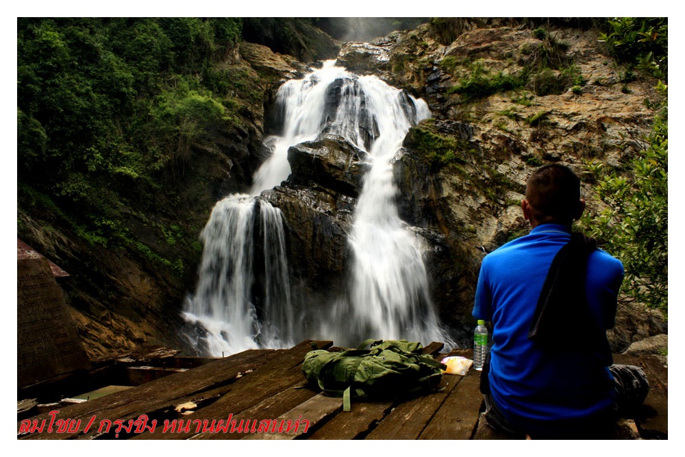 ยิ่งใหญ่จริง ๆ สายน้ำตกตรงหน้า ความสูงโดยประมาณผมว่าไม่น่าต่ำกว่าเจ็ดสิบเมตร ละอองขาว ๆ ที่เห็นด้านบนตัวน้ำตก ผมว่าน่าจะเป็นที่มาของคำว่า ฝนแสนห่า ขนาดผมนั่งห่างตั้งไกลละอองน้ำยังปลิวมาถูกจนเหมือนเม็ดฝน