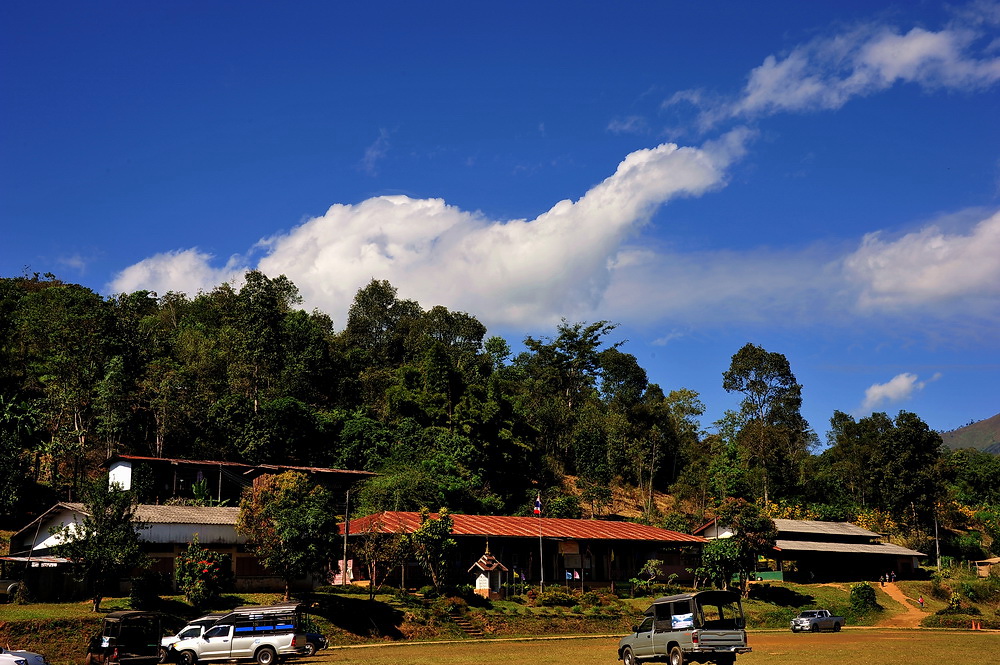 วันนี้ฟ้าใส แดดแรงมาก แต่พอเราอยู่ที่ร่มๆแล้ว เราจะรู้สึกว่าอากาศเย็นสบายครับ จุดนี้เป็นโรงเรียนครับ เป็นจุดท่ารถสองแถวซื้อบัตรขึ้นชมปางอุ๋งครับ