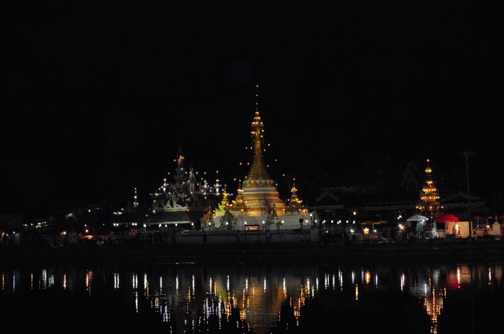 เจดีย์ที่ส่งประกายสีทองเมื่อต้องแสงไฟของวัดจองคำ