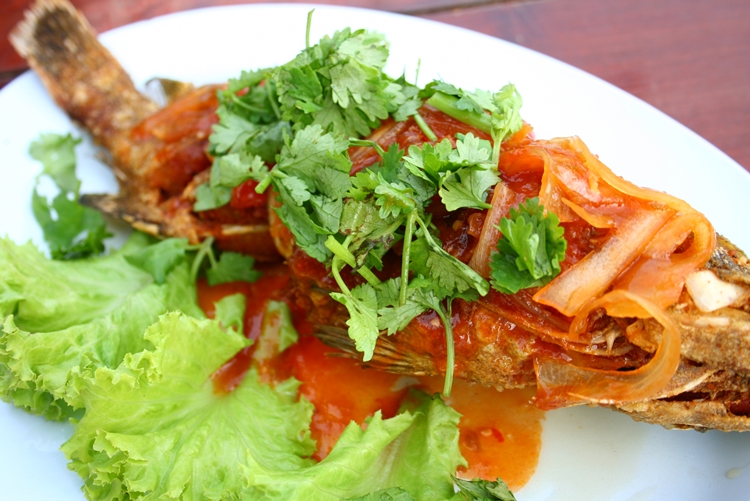 หรือจะเป็นปลากระพงทอดราดน้ำปลารสชาติเค็มหน่อยทอดกรอบๆๆๆ.......อืมอร่อยดีค่ะ