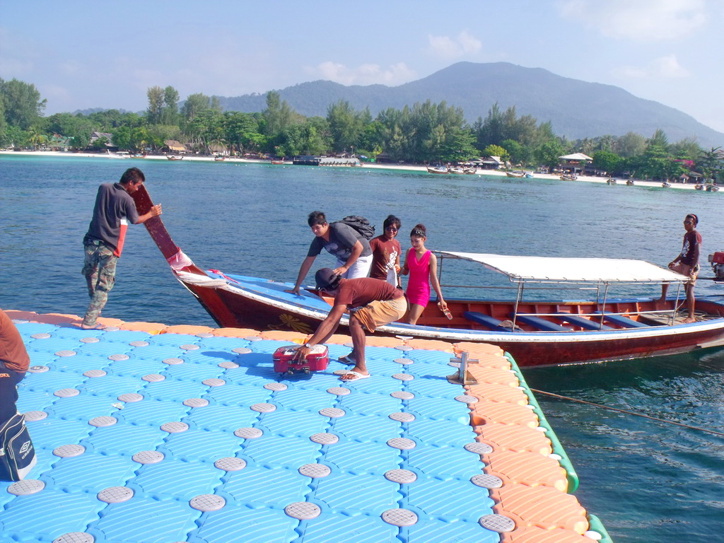 ท่าเทียบเรือใหญ่ เป็นทุ่นแพ ลอยอยู่ในทะเล ไม่ห่างจากฝั่งมากนัก