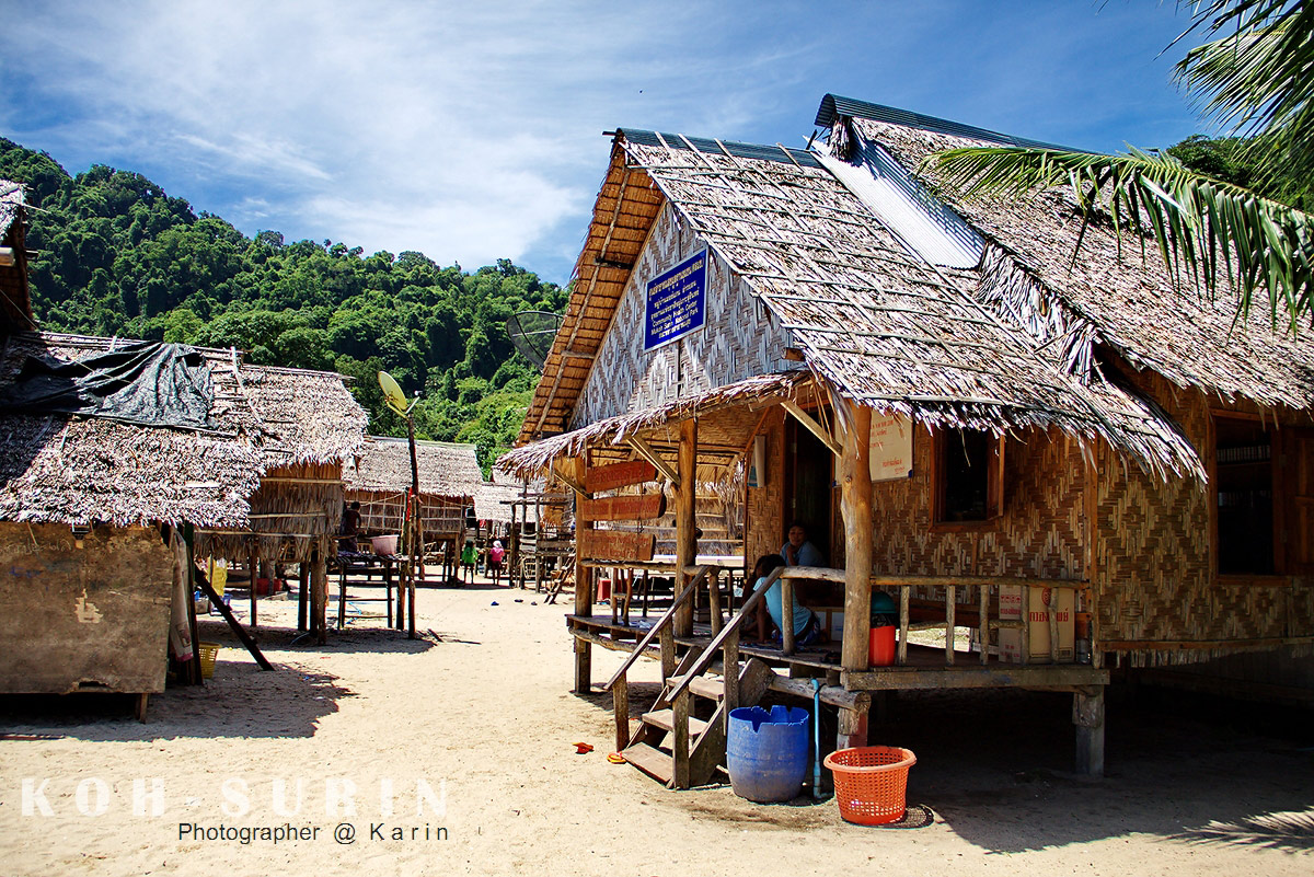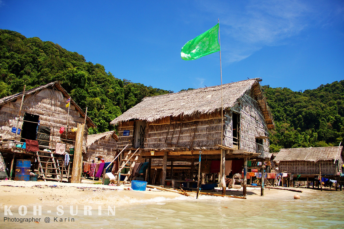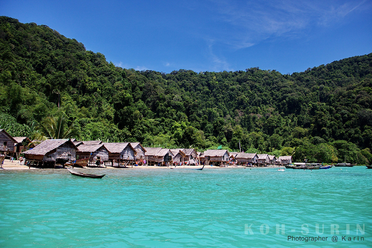 ถึงแล้วหมู่เกาะสุรินทร์ ที่เห็นบ้านหลังๆ ติดกับทะเลนั้นคือหมู่บ้านเผ่ามอแกนแห่งหมู่เกาะสุรินทร์ครับ