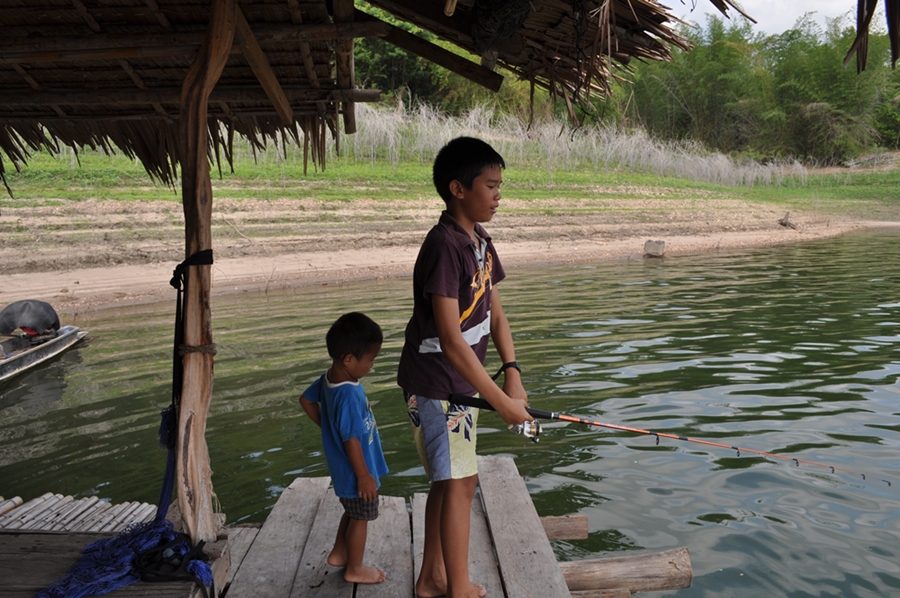 อิ่มสบายท้องแล้ว น้องไทเกอร์อู๊ดก็จับคันเบ็ต ตกปลาโดยมีไส้เดือนที่ขุดมาจากตลิ่งเป็นเหยื่อ