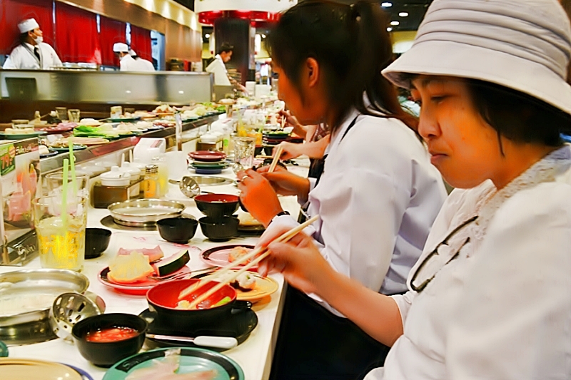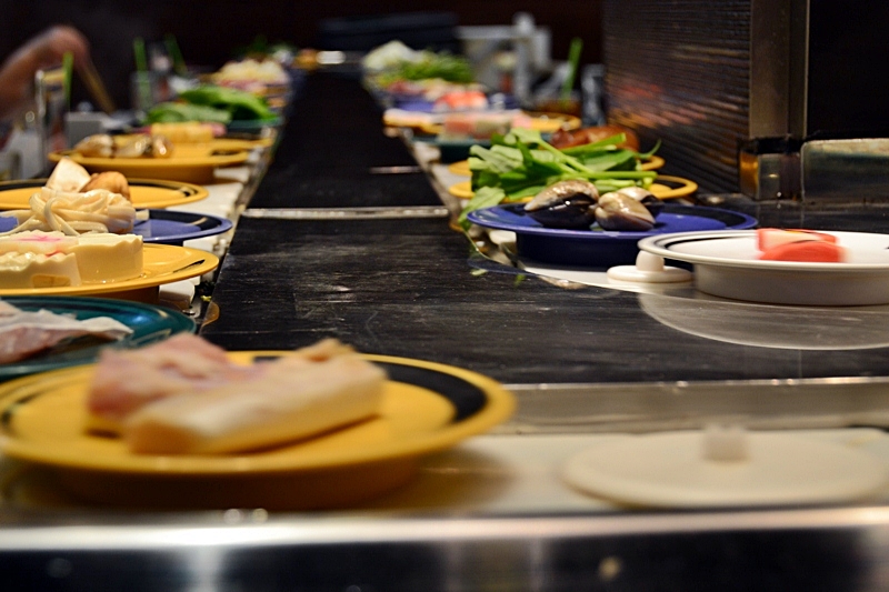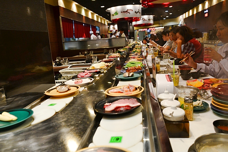 อาหารเลื่อนตามสายพานผ่านหน้าไป หยิบได้ไม่มีอั้น ทานกันเต็มหนึ่งชั่วโมงเศษ