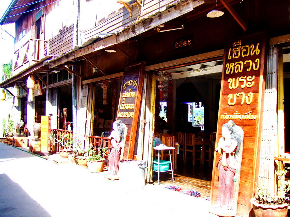 เฮือนหลวงพระบาง มีร้านอาหาร ตอนกลางคืน บรรยากาศดีมาก มองเห็แม่น้ำโขงและฝั่งลาว