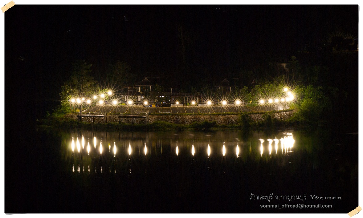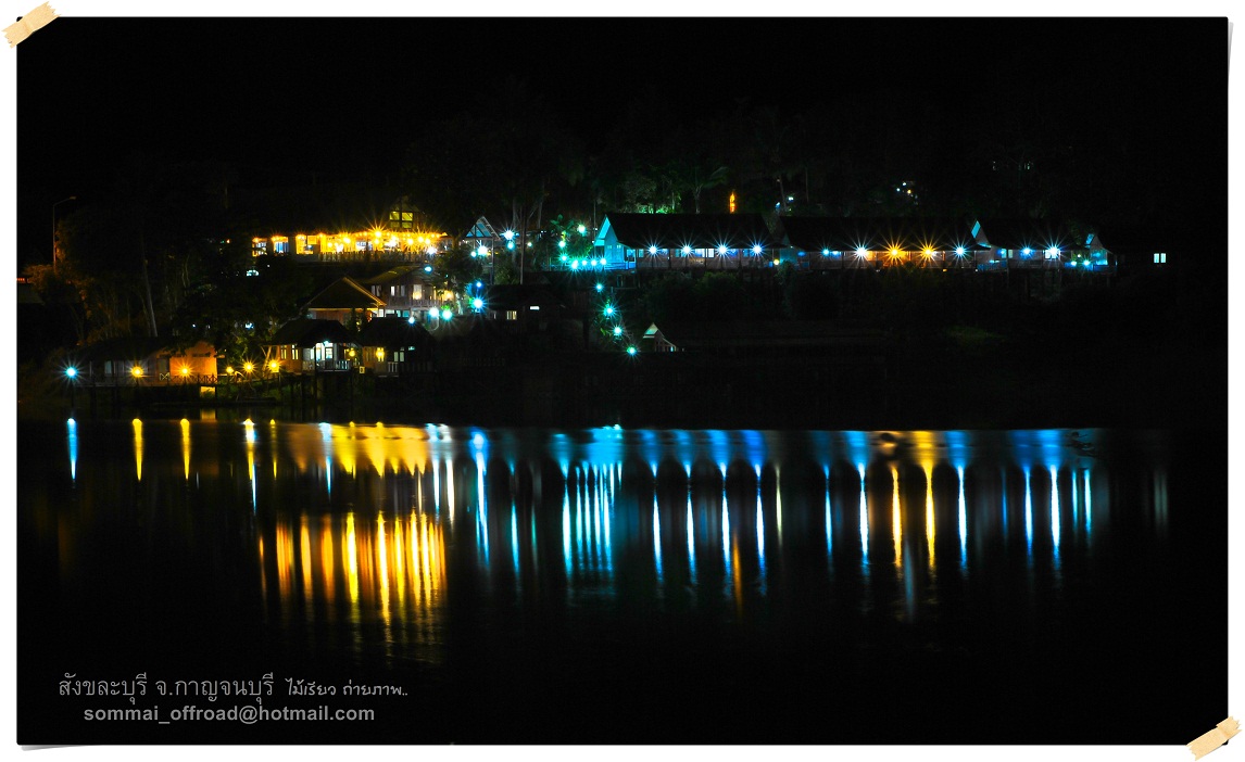 ในช่วงของค่ำคืนของวงสนทนา เราจะได้ยินเสียงของดนตรีจากรีสอร์ทที่อยู่ตรงข้ามดังไปทั่วคุ้งน้ำ พร้อมกับสาดแสงสีสันหลอดไฟให้ในยามค่ำคืนของเมืองสังขละแลดูมีสีสันสวยงาม
