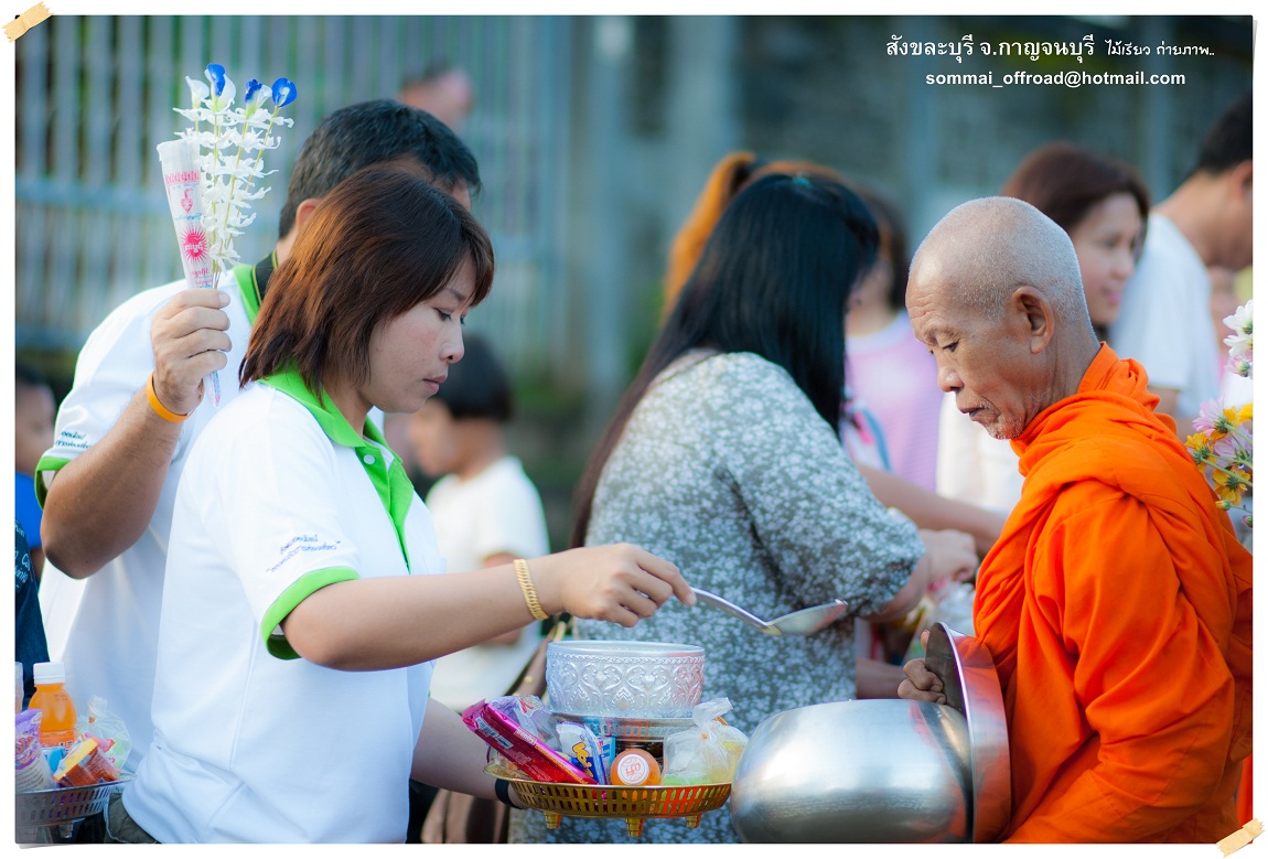 บรรยากาศยามเช้าบน สะพานมอญ ในช่วงเสาร์-อาทิตย์ เริ่มคึกคักชาวมอญเพื่อมาใส่บาตรพระ ในช่วงเวลาประมาณ 6 โมงเช้ากว่าๆ พระเณรหลายสิบรูปเริ่มเดินเท้าทยอยมารับบาตรท่ามกลางอากาศที่เย็นสบาย