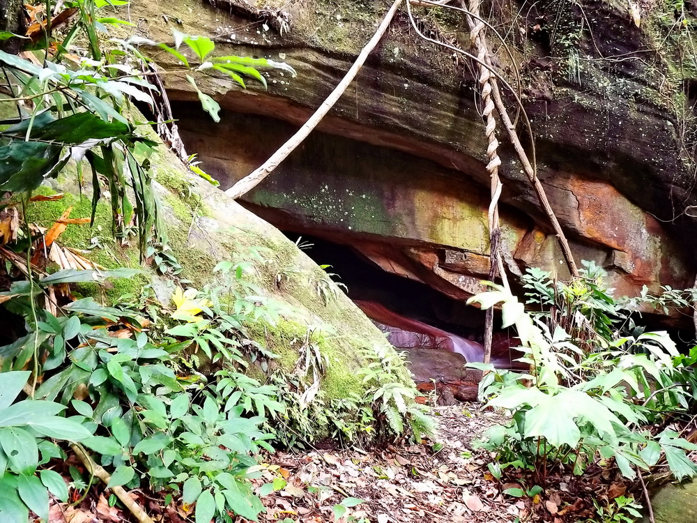 ปากทางเข้าน้ำตกลอดรู จะเป็นเหมือนเขาไปในปล่อง ในหลืบ ซึ่งจะมีแสงส่องลงไปได้ แต่ไม่มาก