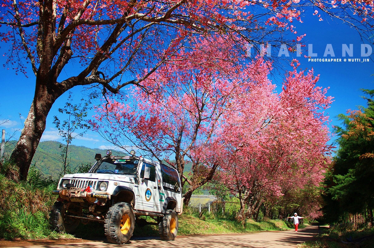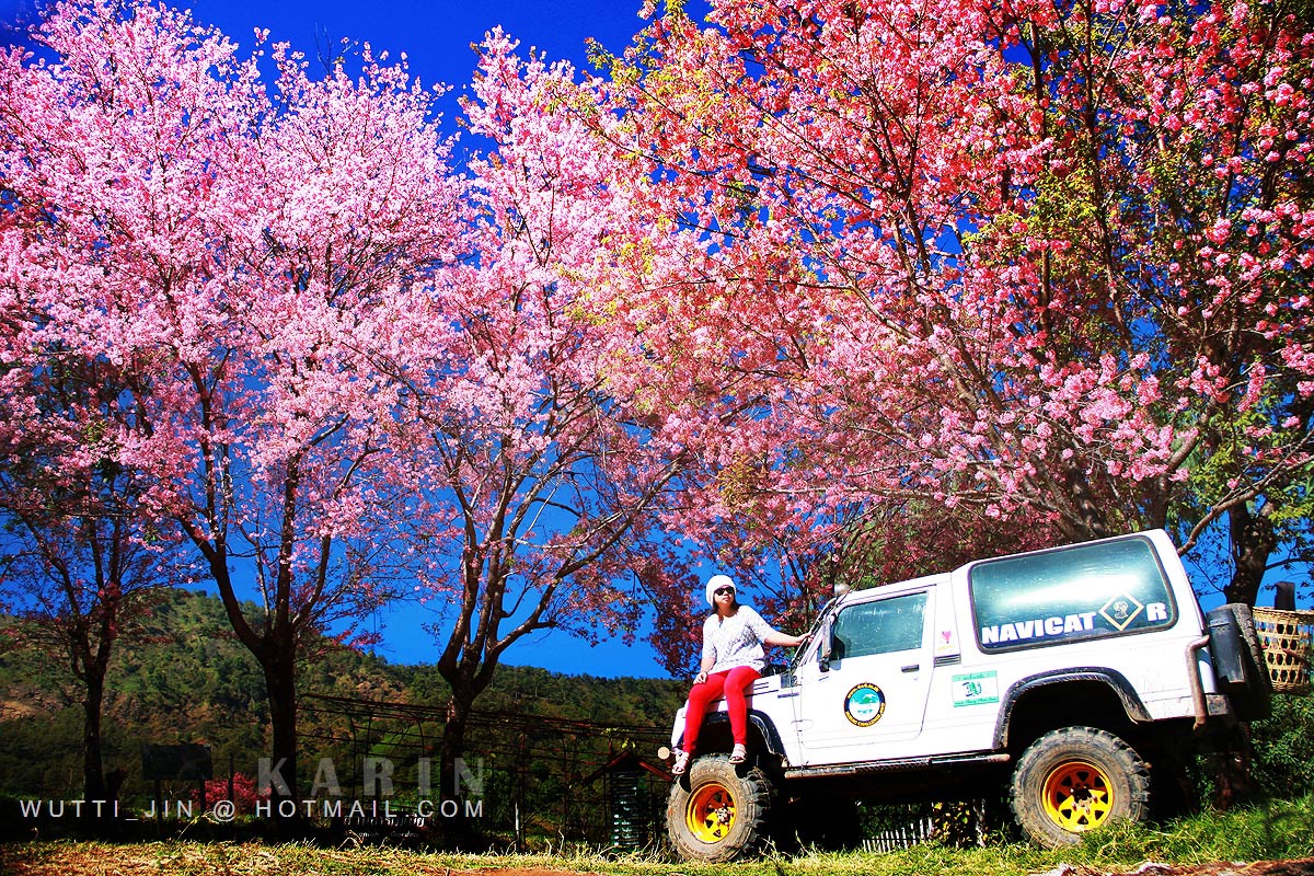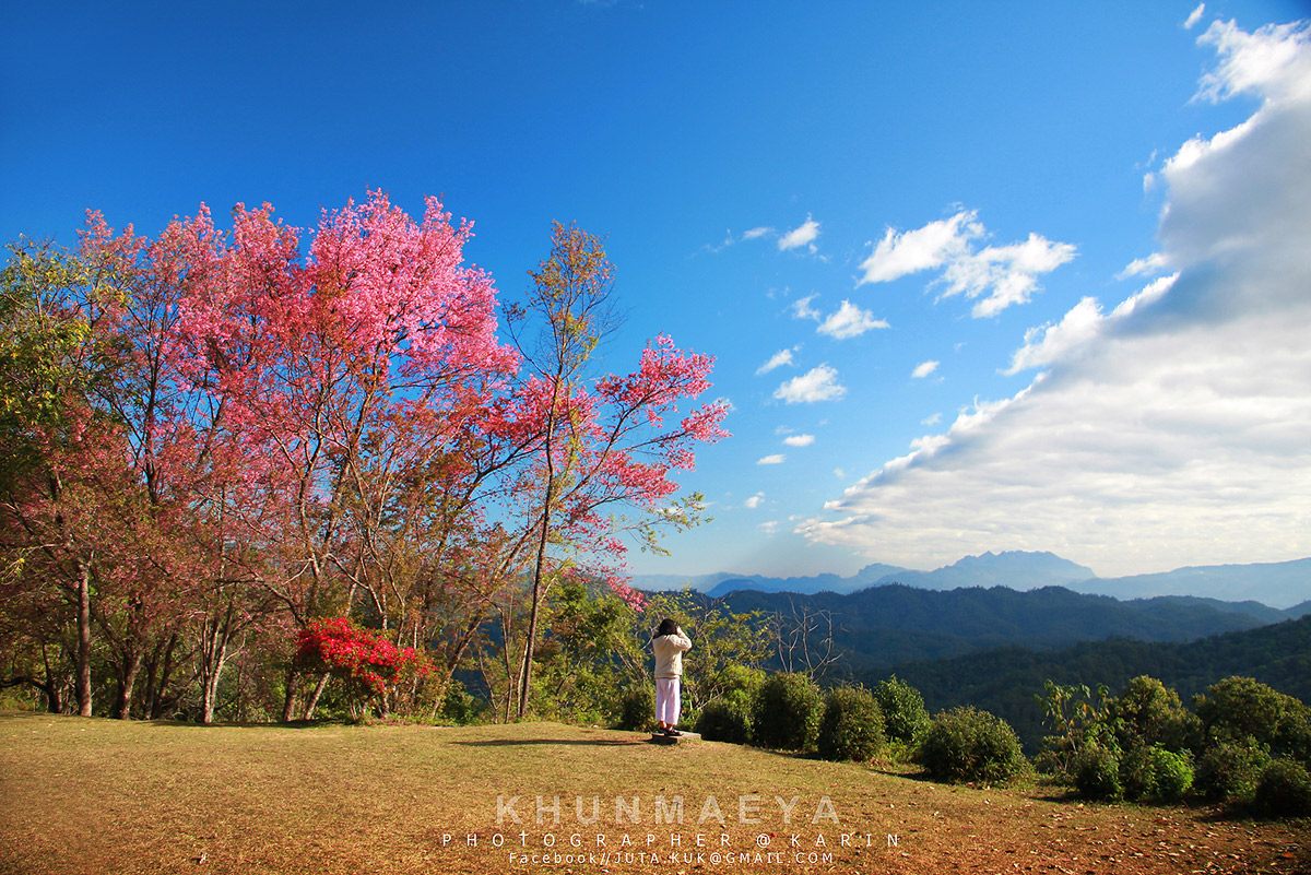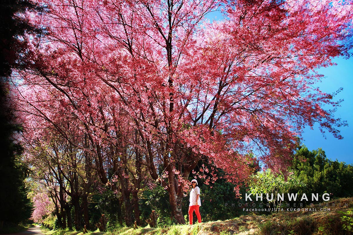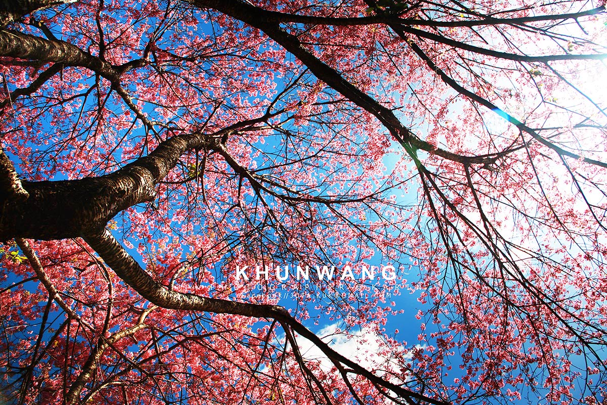 ยามที่อากาศมันช่างหนาว ท้องฟ้าเป็นสีคราม ผสมกับแนวของต้นไม้ที่เต็มไปด้วยสีชมพูตลอดทั้งแนวถนน ที่มองมาจากด้านไกลจะสะพรั่งทั่วทั้งดอย