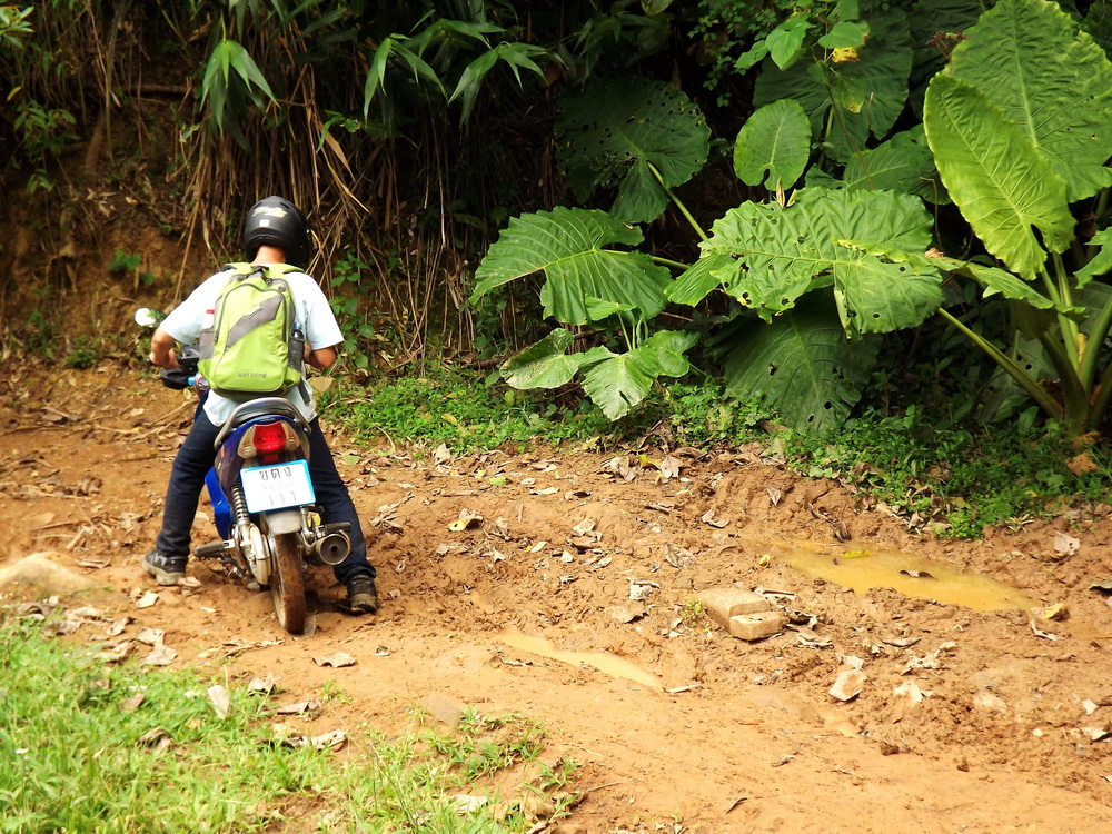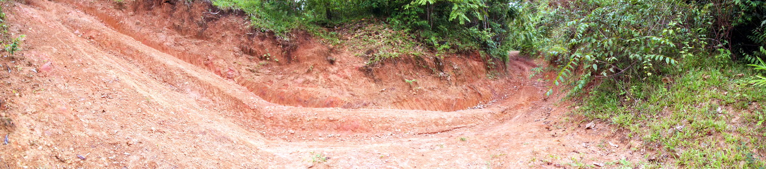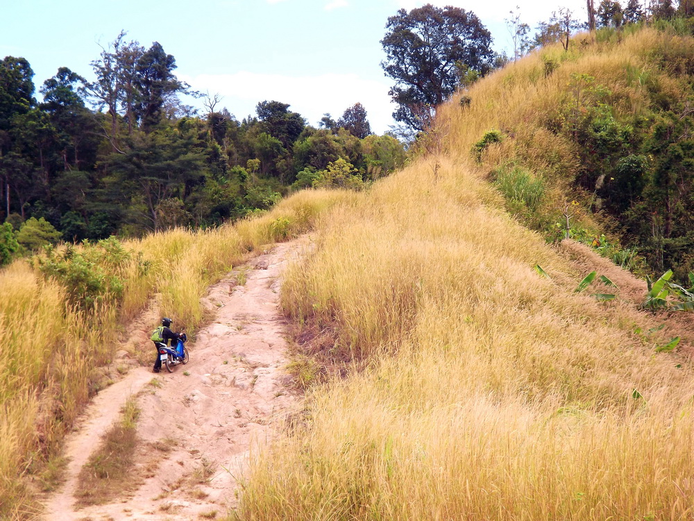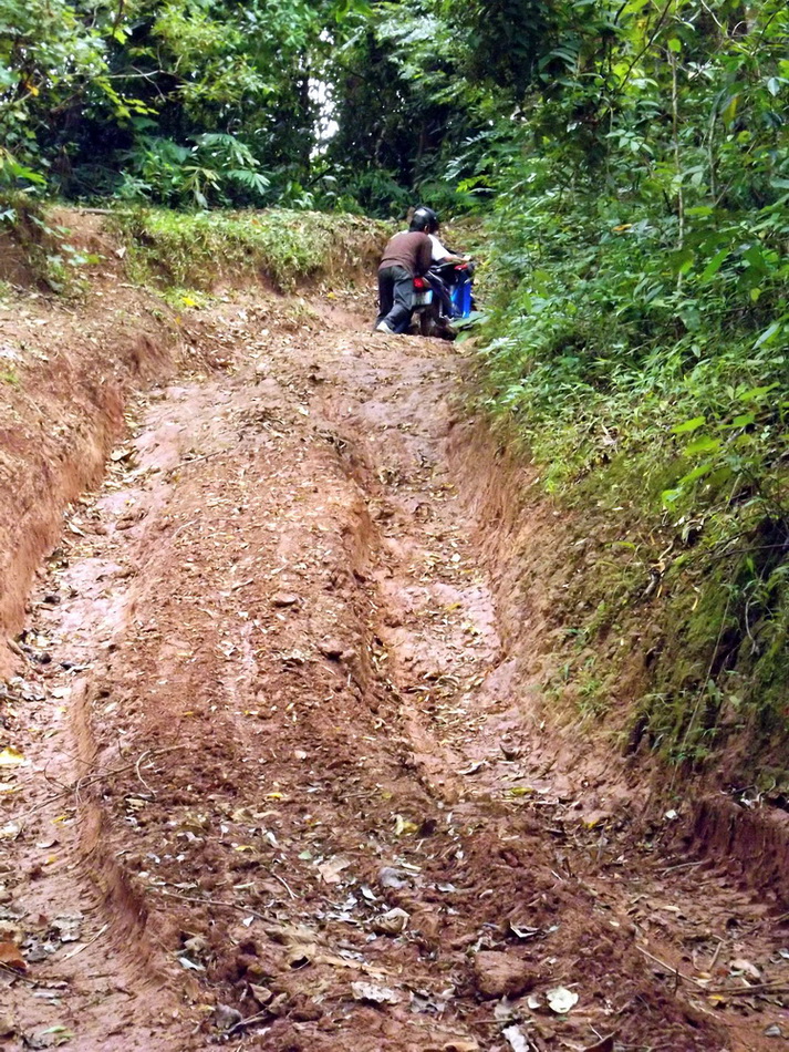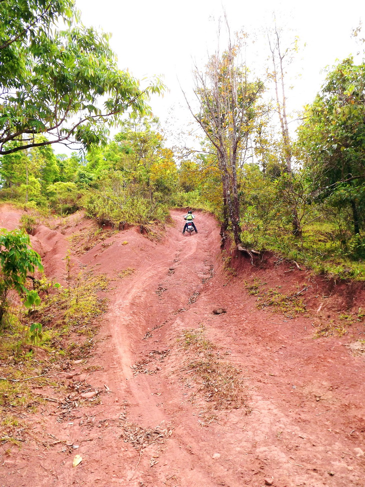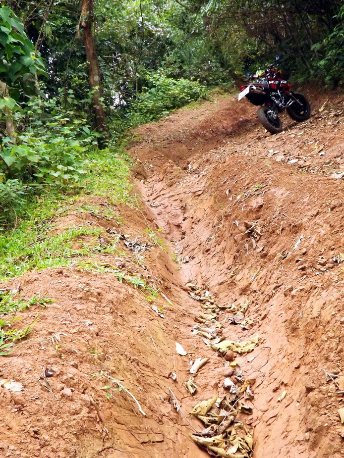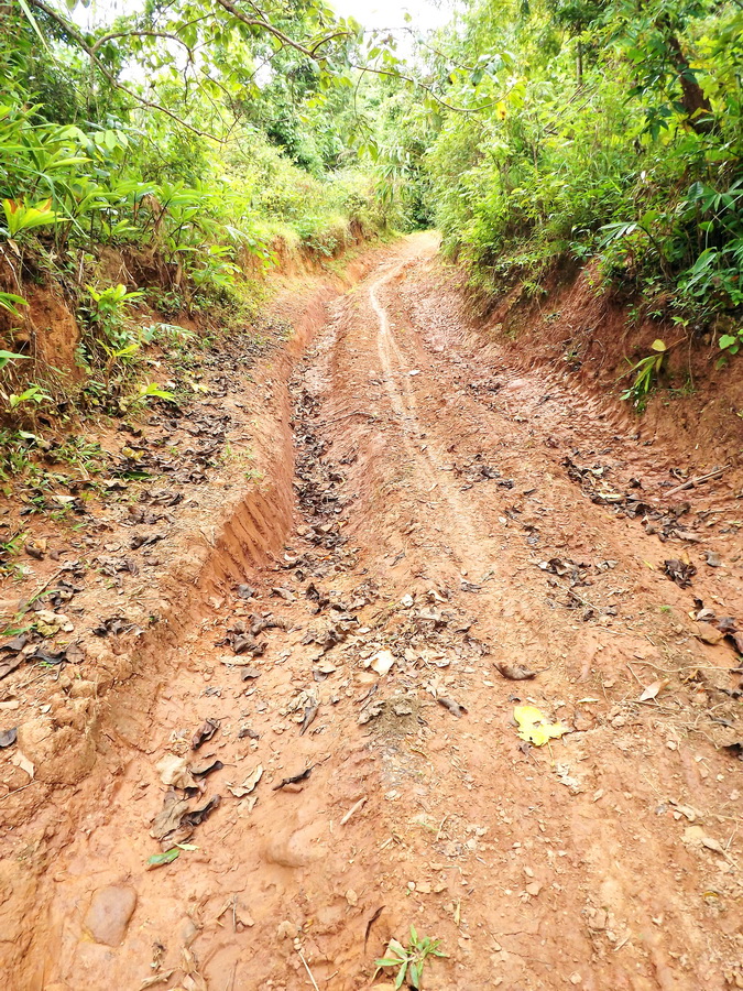 ไปกันต่อครับ ก็จะถึงทางลาดชันขึ้นเขาไปเรื่อย ๆ ช่วงนี้จะเป็นแค่สันตรงกลางให้วิ่งได้หน่อยเดียว ส่วนด้านข้าง จะเป็นหลุมร่องล้อรถยนต์รูปตัว V ครับ