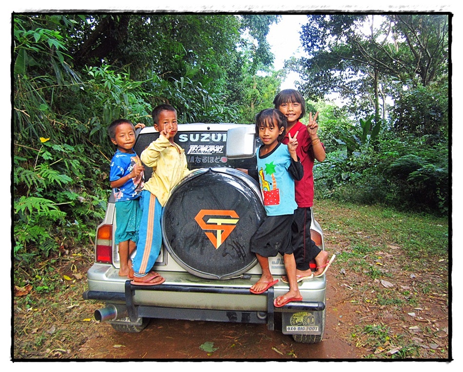 ทางเข้าเจอเด็กๆ 4 คนนี้ดักอยู่..ผมก็ขับเข้ามาโดยมีเด็กๆวิ่งตาม..เด็กคนที่ 2 ซ้ายมือกระโดดเกาะยางท้ายรถขึ้นมา..ผมมองผ่านกระจกหลังเห็นหน้าเด็กแนบติดกับกระจกหลังรถ..ก็หยุดรถลงไปดูโดยมีเด็กอีก 3คนวิ่งตามมาพอดี..ว่าแล้วเด็กอีก 3คนก็ขึ้นไปบ้าง...ผมก็ว่าถ้าตกมาทำไงนี่ อันตรายนะ..แต่ว่ายังไงเด็กก็ไม่ยอมลง..บอกว่าจะขึ้นไปด้วย..กรรมล่ะ..จะไปได้ไง..เดี๋ยงพ่อแม่จะมาว่าเราไหมนะ..จะกลายเป็นคนลักเด็กไปรึเปล่า..คุยอยู่นานไม่เป็นผล..ไปก็ไปนะ..ว่าแล้วก็พาขึ้นไปทั้งแบบนั้น..โดยที่ผมค่อยๆขับขึ้นไปกลัวเด็กจะตกลงมา..เดียวไม่มีใช้พ่อแม่เด็ก..