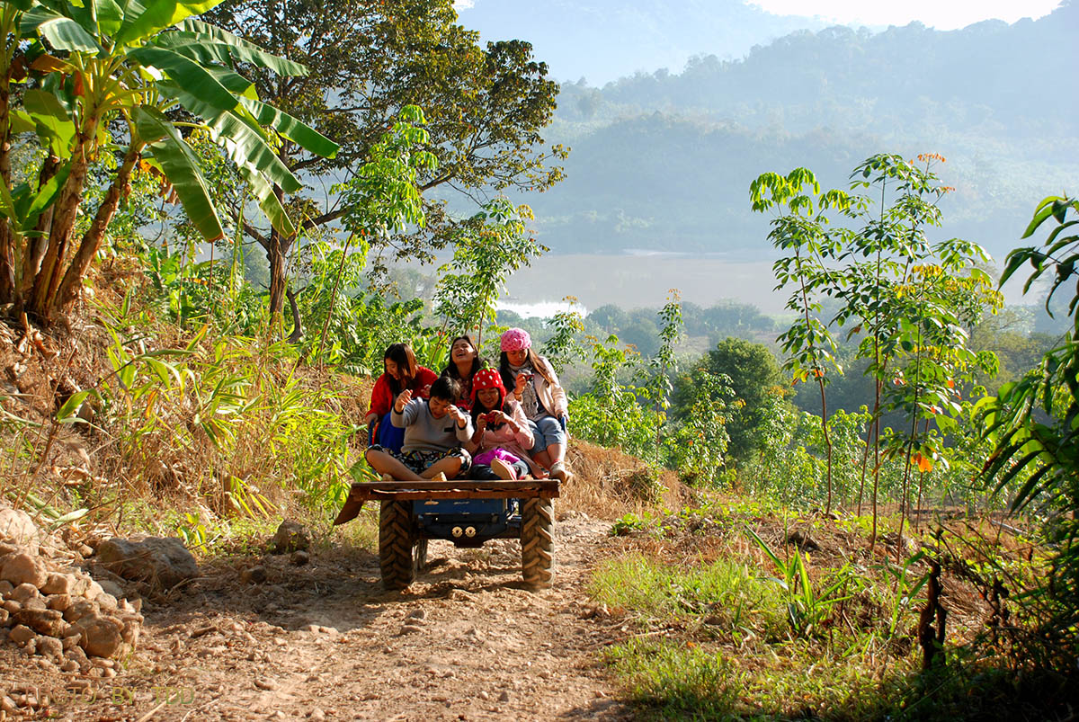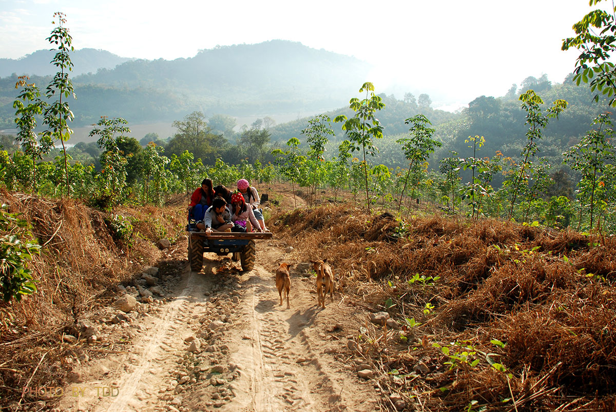 ทางขึ้นเขาประมาณ 2 กม ใช้รถไถนาดัดแปลงที่ชาวบ้านทำเองไม่มีราวกันตกครับต้องระวังเวลานั่ง อากาศด้านบนภูเขาประมาณ 10 องศา มือถือกล้องสั่นนิด ๆ สภาพบริเวณที่ถ่ายเป็นป่ากล้วยของชาวบ้านยังรกอยู่ บริเวณนี้จะมีหมีจากฝั่งลาวข้ามมาหากินมีลุ้นปนหวาดเสียวถ่ายไประวังหลังไป