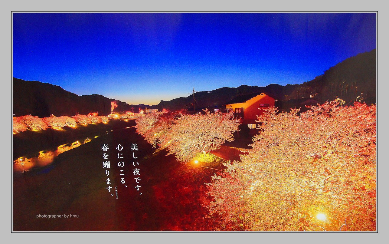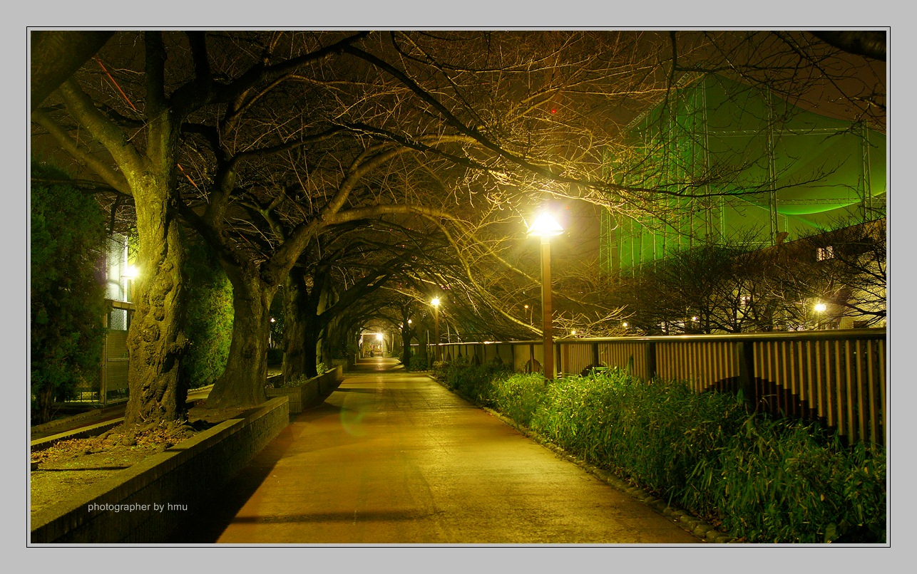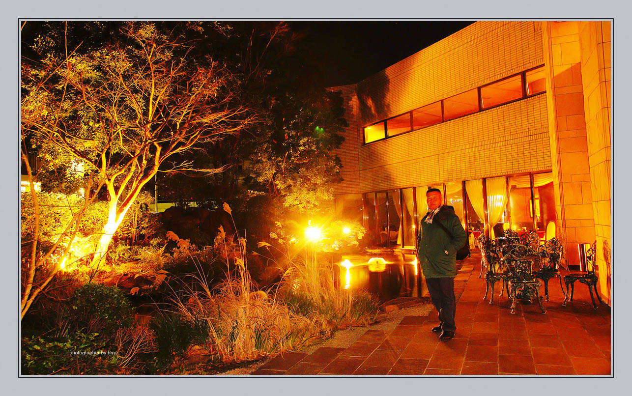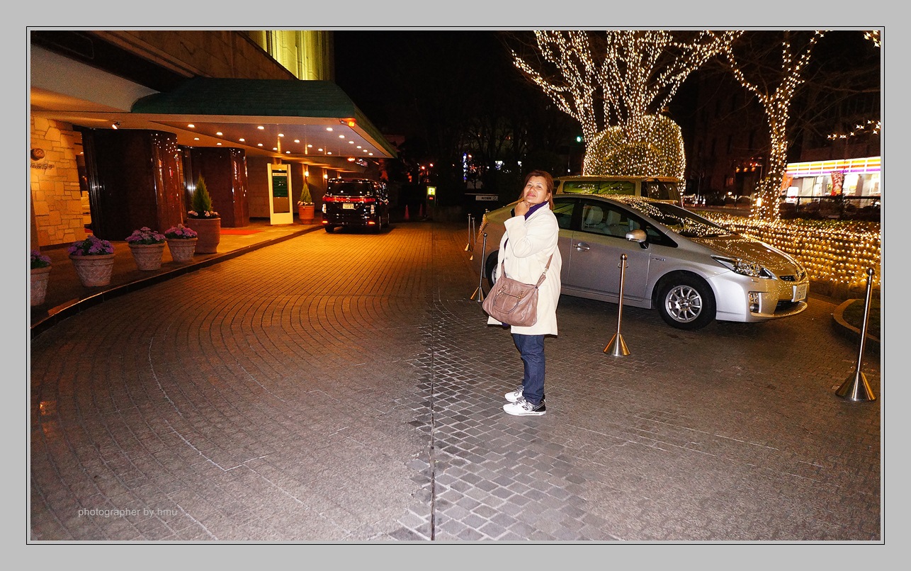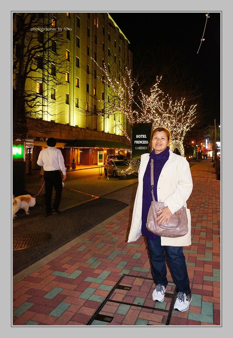 หน้าโรงแรมมีต้นซากุระเยอะมาก ประดับไฟสวยงาม