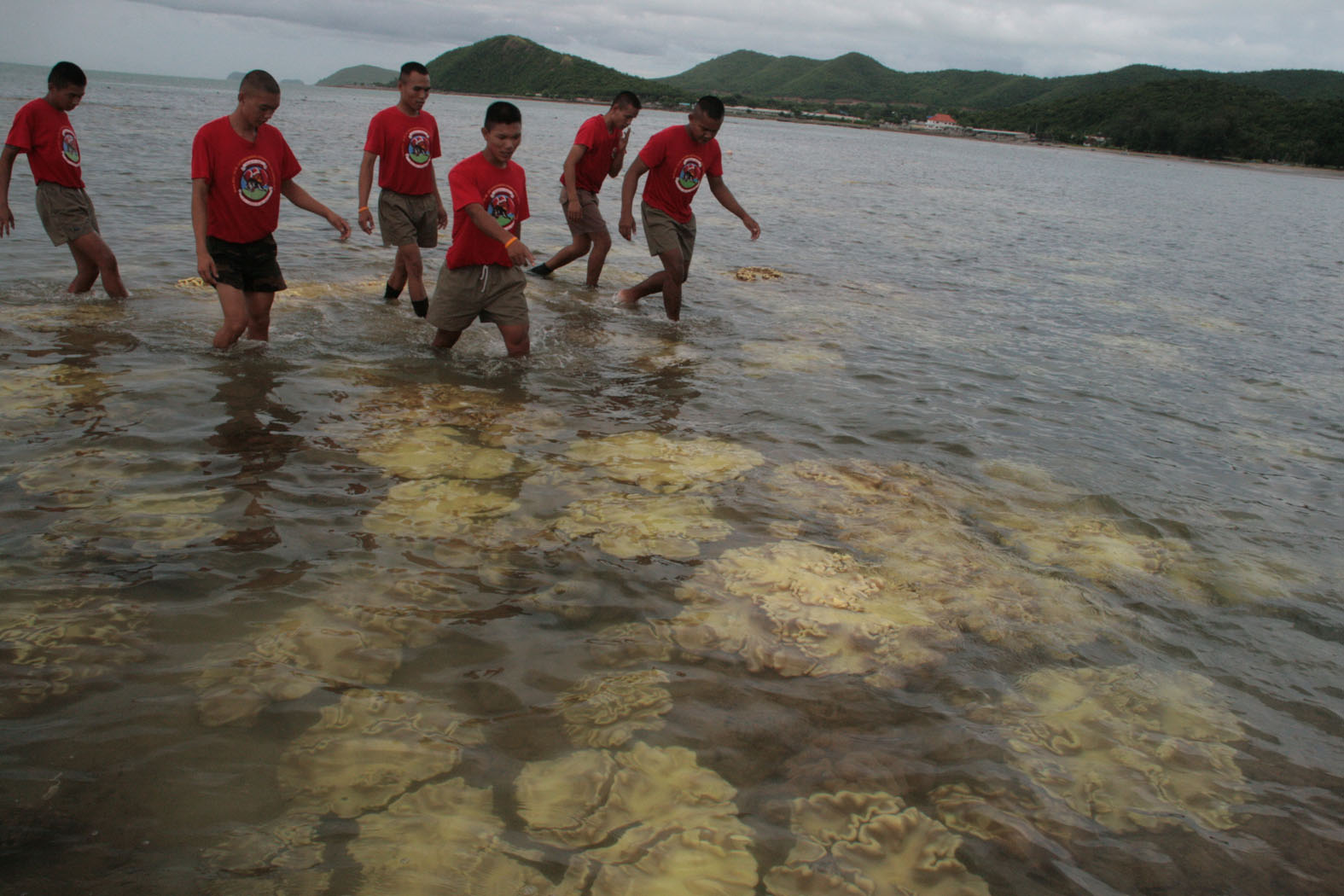 ทหารนักรบนาวิกโยธินเฮ..หวังบูมการท่องเที่ยวเชิงอนุรักษ์ ชมของแปลกเขตทหาร ชมปรากฎการณ์ปะการังสีทองโผล่ดาษดื่นเต็มหาดสีทอง อ่าวกองพลนาวิกโยธิน เป็นครั้งที่ 3 ยังไม่เบี่ยงเบนความเชื่อเรื่องสิริมงคล ทหารใส่เสื้อแดงลงสำรวจ พบกำลังเบ่งบานเหลืองอร่าม