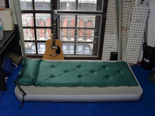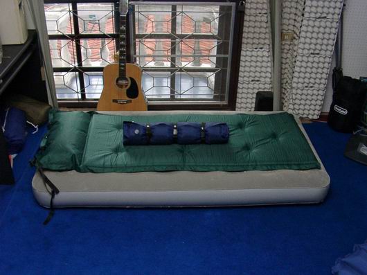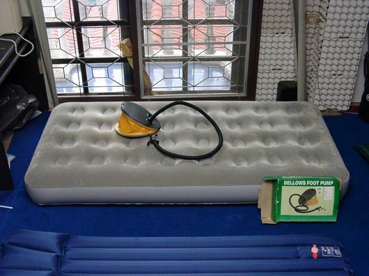 อย่างที่โฆษณาในทีวี คงต้องหาที่ทราเวลเกียร์ละครับ อาจจะกว้างถึง150ซม. แต่จะมีปัญหาถ้าสดุ้งตื่นง่ายเพราะมันจะยวบยาบ แนะนำให้ใช้แบบเตียงเดี่วย(ขนาด90ซฒ.)จะดีกว่า ราคาตอนจัดรายการก็จะประมาณพันบาท ใหญ่เล็กราคาไม่ต่างกันมากนัก แต่ก็ควรหาที่เป่าลมแบบใช้แบตฯไปด้วย(ไม่แน่ใจว่ามีขายในนี้หรืเปล่า-ใช้ของที่ซื้อมาจากนอก) เพราะหากใช้ฟุตปั๊มก็จะใช้แรงและเวลาพอควร ปัญหาอีกอย่างคือขนาดของเต้นท์ หากใช้แบบเตียงเดี่ยว 2 อันก็ต้องเป็นเต้นท์7ฟุตขึ้นไป ไม่ขั้นก็ต้องใช้ขนาด140-150แล้วลองดูว่าจะเมาคลื่นหรือเปล่า