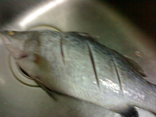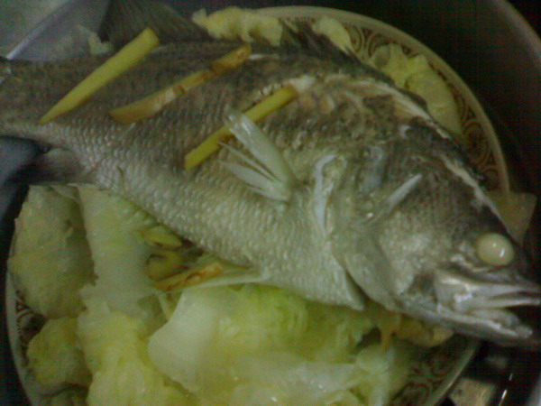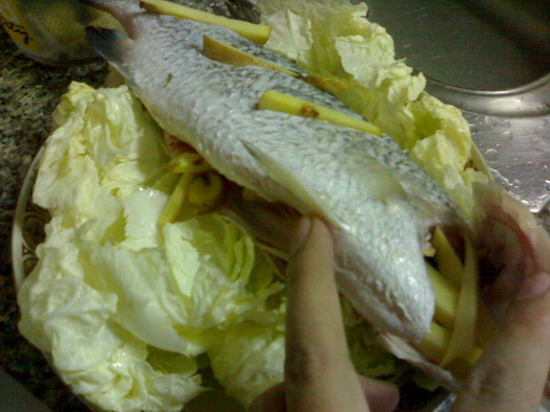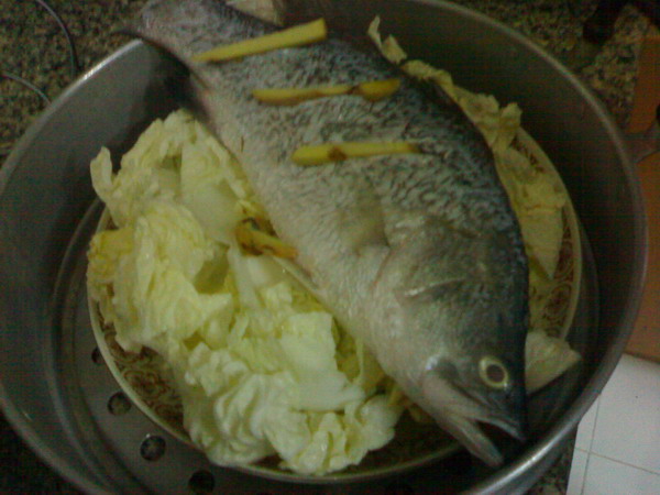 คำตอบที่ 22 ไม่ใส่พริกเพราะท่านสมาชิกสองคนไม่กินเผ็ดเลย ----------- มาที่ปลา ตัดหางเนื่องจากลงซึ้งไม่หมดวางลงบนจานที่รองด้วยผักกาดขาวยัดท้องและปากด้วยขิง