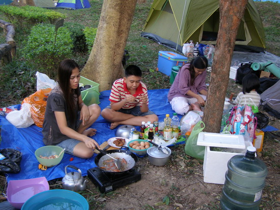 ส่วนภาพนี้หลังจากหาทำเลที่ตั้งกางเต็นท์นอนได้ที่ใต้ร่มไม้ แถบริมน้ำไม่มีครับ และก็เป็นที่โล่ง แดดจัด บรรดาแม่บ้านก็เริ่มทำอาหารกินกันแล้ว